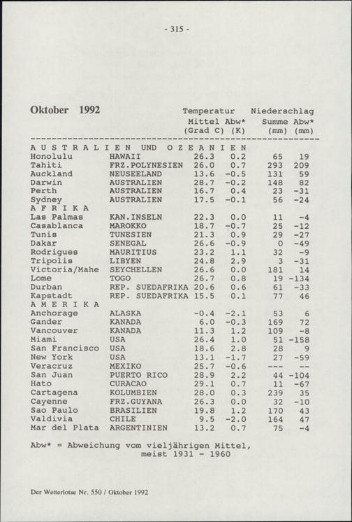 Statistik der Wetterbeobachtungen Oktober 1992