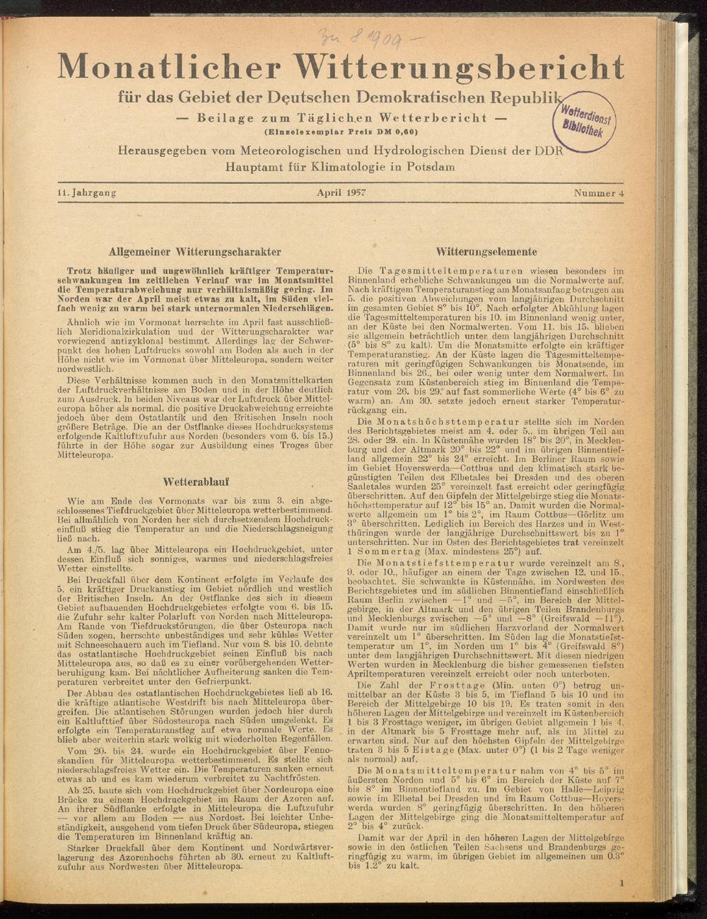 Monatlicher Witterungsbericht für das Gebiet der Deutschen Demokratischen Republ...