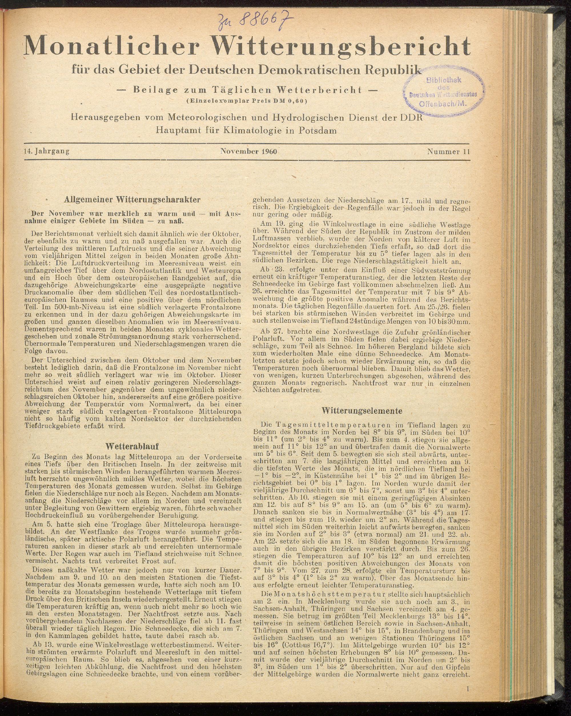 Monatlicher Witterungsbericht für das Gebiet der Deutschen Demokratischen Republ...