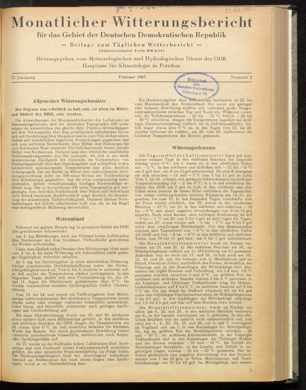 Monatlicher Witterungsbericht für das Gebiet der Deutschen Demokratischen Republ...