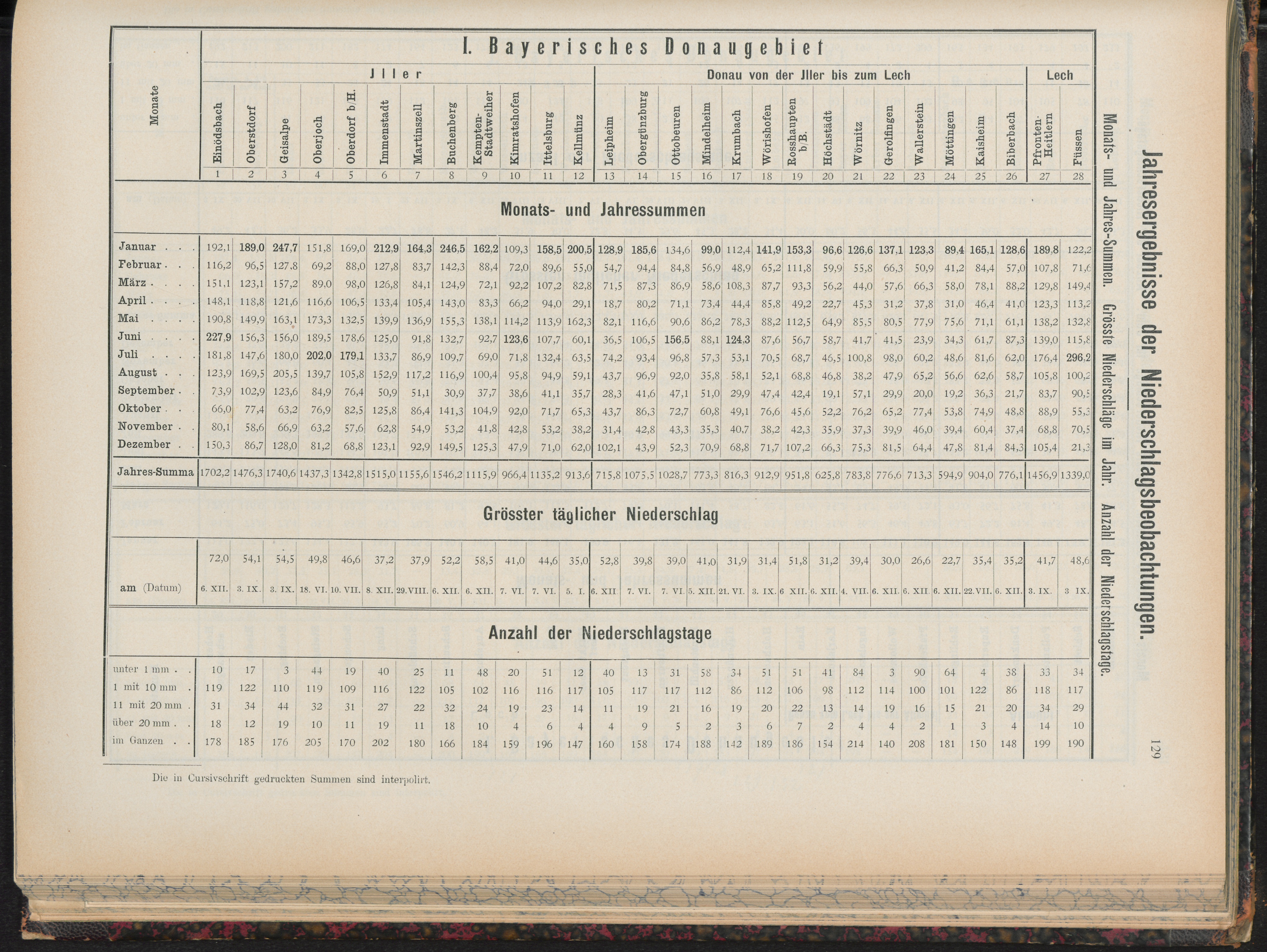 Monats- und Jahressummen ; größter täglicher Niederschlag, Anzahl der Niederschl...
