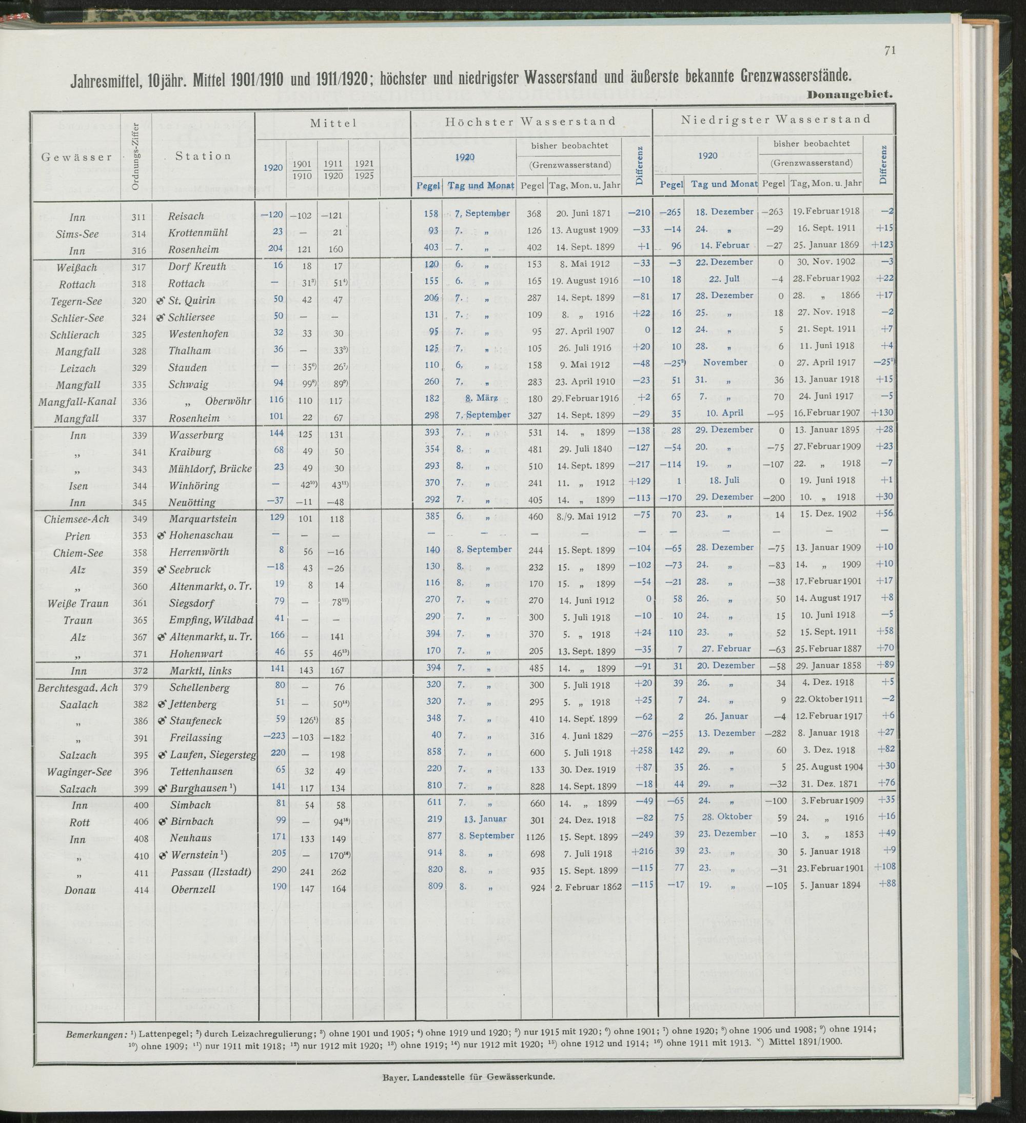 Jahresmittel, 10jährige Mittel 1901/10 und 1911/20 höchster und niedrigster Wasserstand und äußerste bekannte Grenzwasserstände