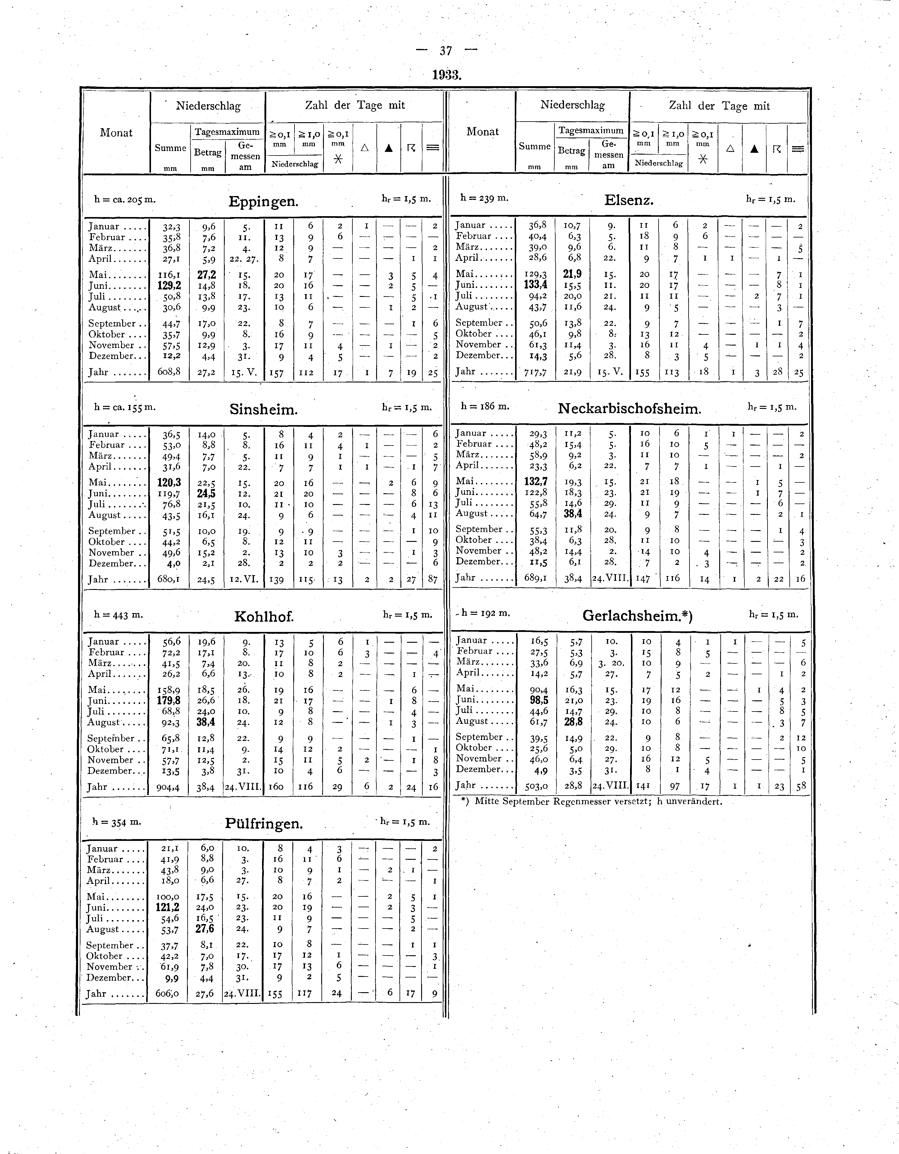 Monats- und Jahresergebnisse der Beobachtungen der Regenstationen 1933