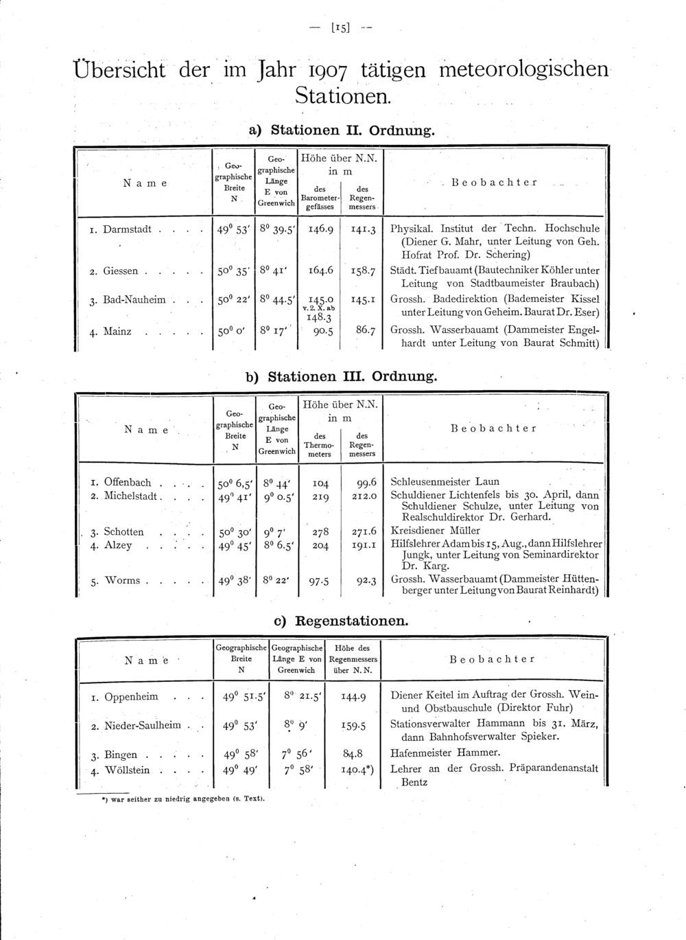 Übersicht der im Jahre 1907 tätigen meteorologischen Stationen