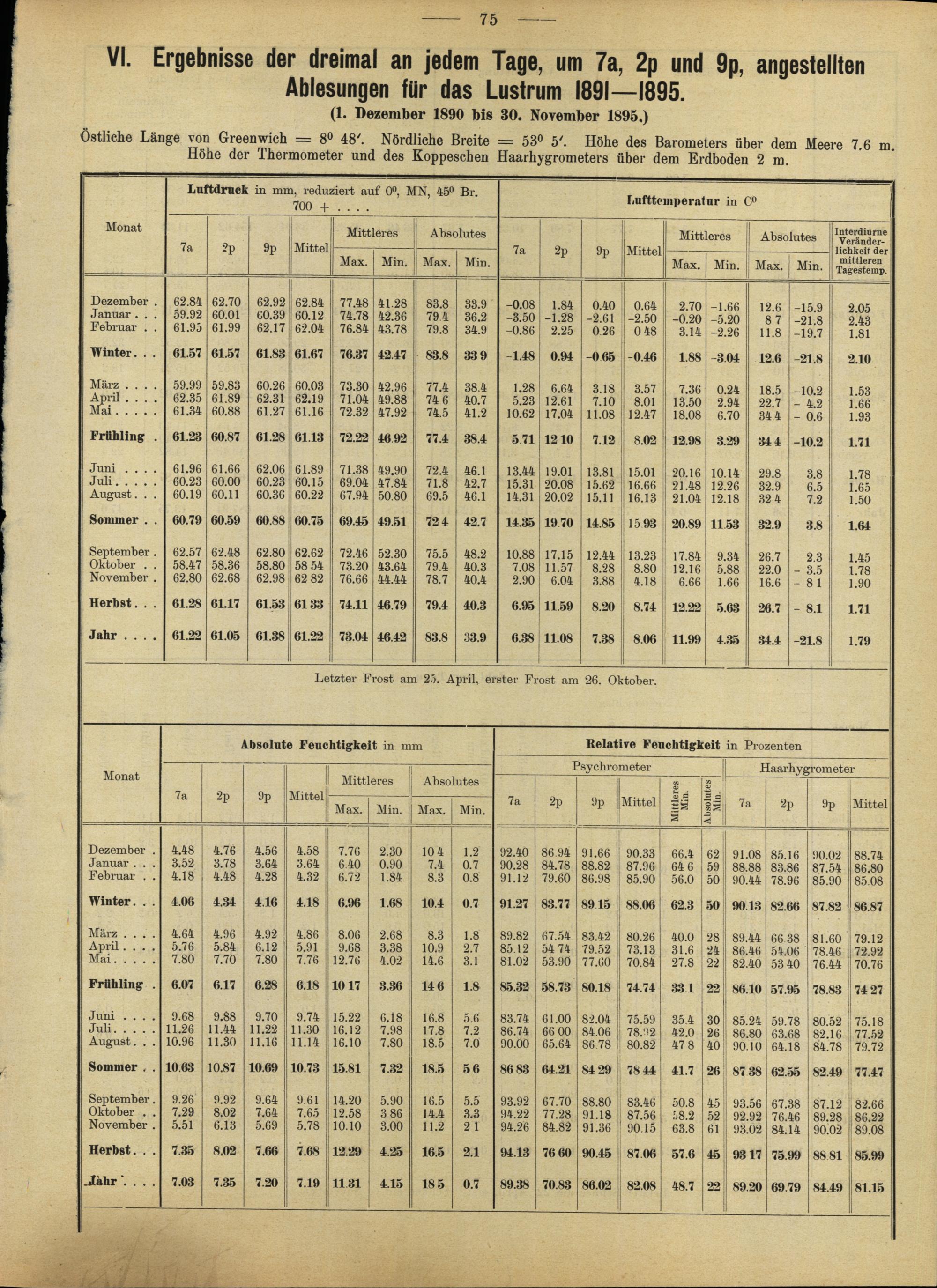 VI. Ergebnisse der dreimal an jedem Tage, um 7a, 2p und 9p ausgeführten Ablesungen für das Lustrum 1891-1895