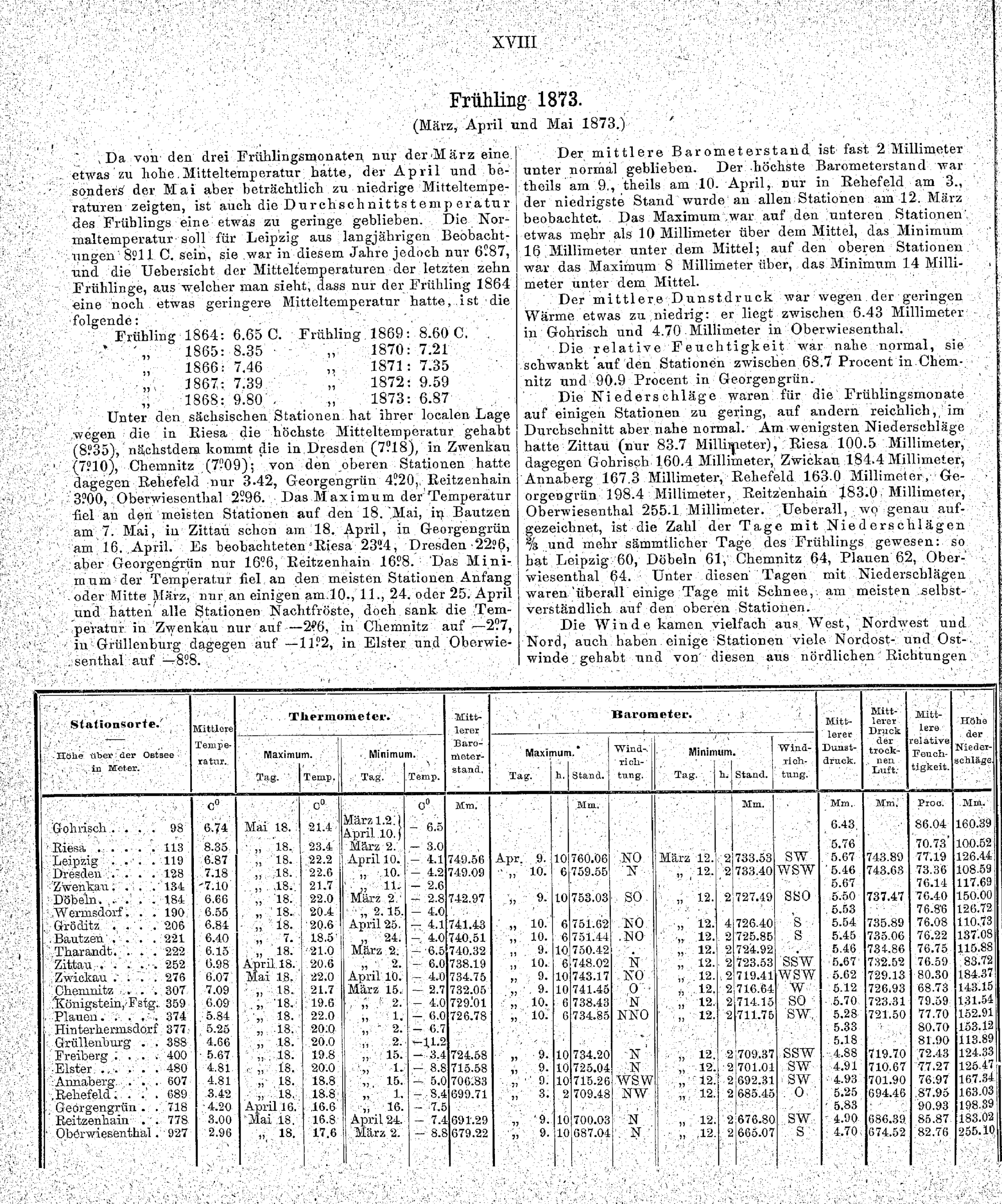 Uebersicht der Resultate aus Beobachtungen auf den meteorologischen Stationen im Königreiche Sachsen für das Jahr 1873 / C. Bruhns