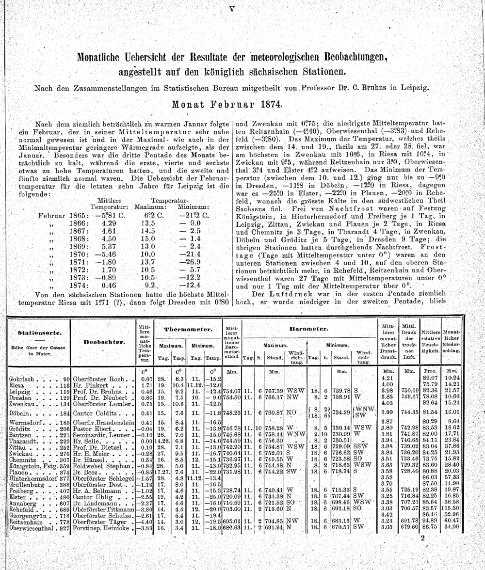 Uebersicht der Resultate aus Beobachtungen auf den meteorologischen Stationen im Königreiche Sachsen für das Jahr 1874 / C. Bruhns