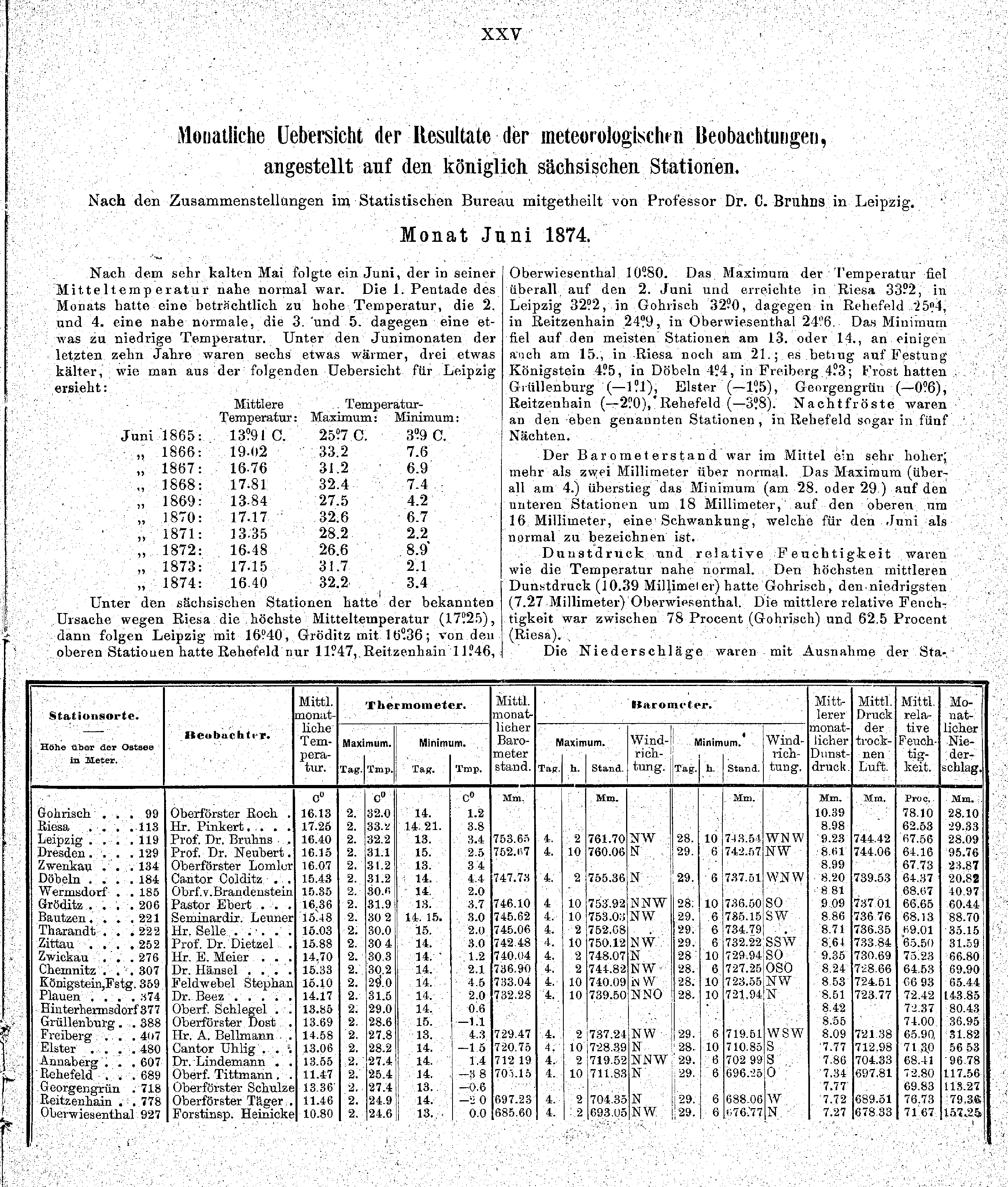 Uebersicht der Resultate aus Beobachtungen auf den meteorologischen Stationen im Königreiche Sachsen für das Jahr 1874 / C. Bruhns