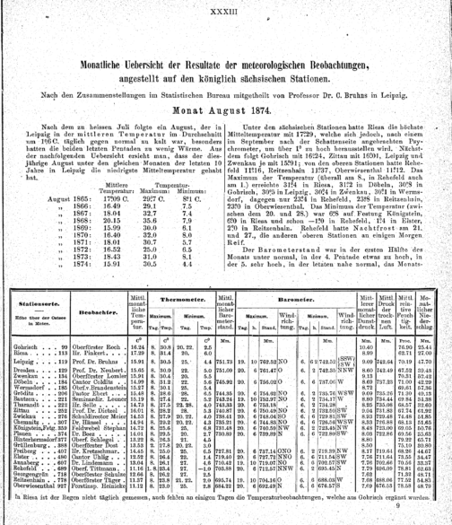 Uebersicht der Resultate aus Beobachtungen auf den meteorologischen Stationen im Königreiche Sachsen für das Jahr 1874 / C. Bruhns