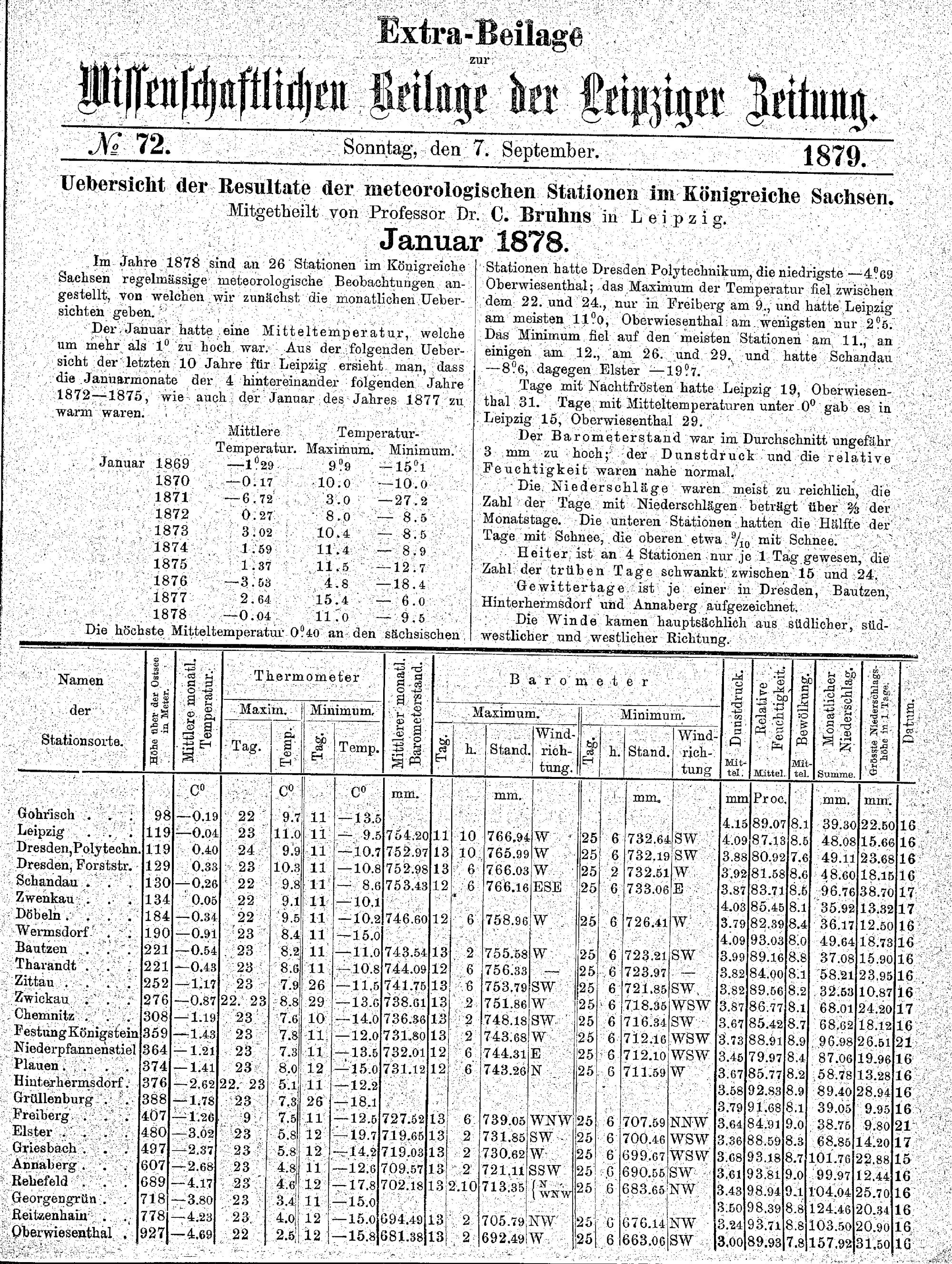 Uebersicht der Resultate der meteorologischen Stationen im Königreiche Sachsen für das Jahr 1878 / C. Bruhns