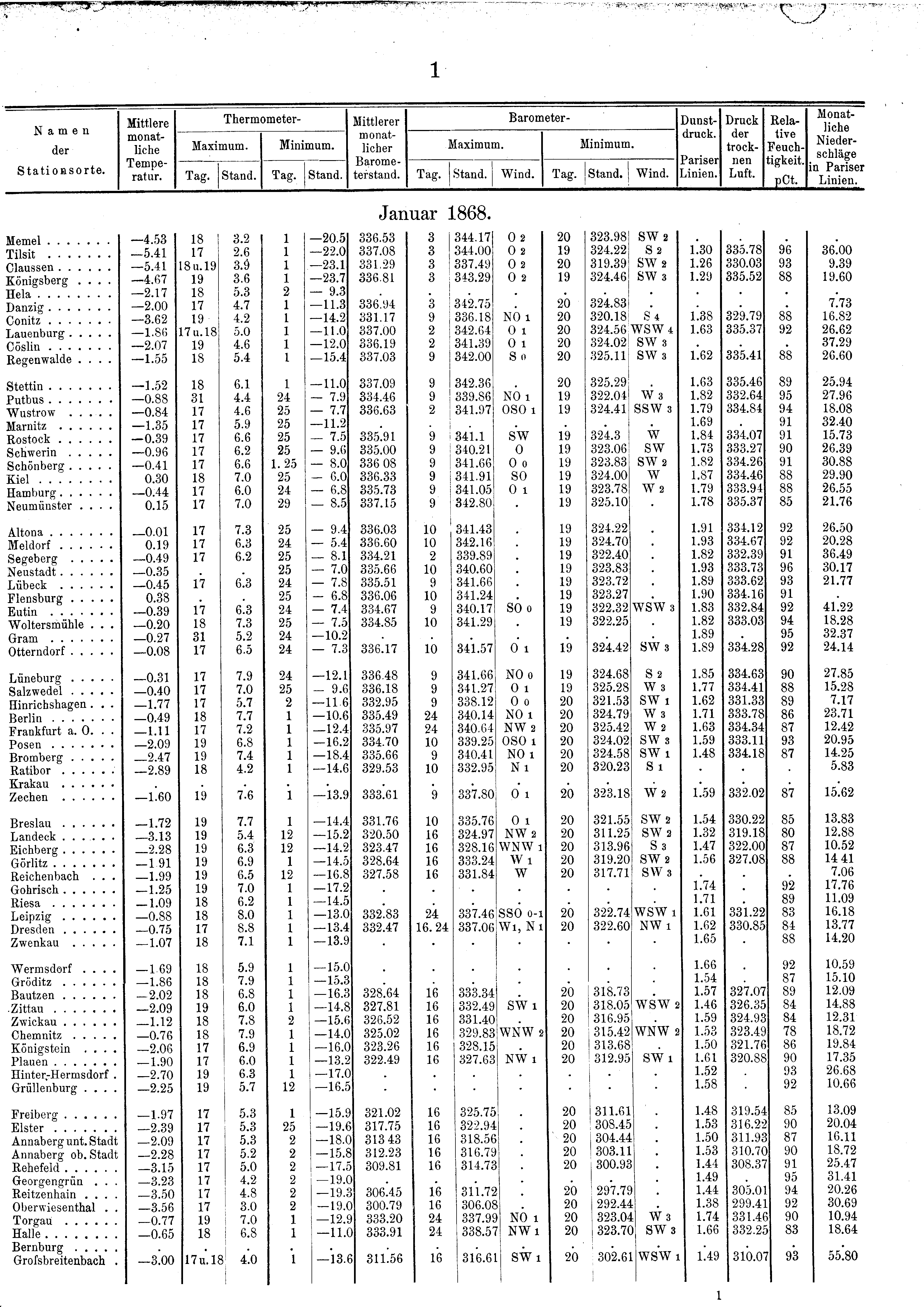 Monatliche Mittel des Jahrganges ... für Druck, Temperatur, Feuchtigkeit und Niederschläge...