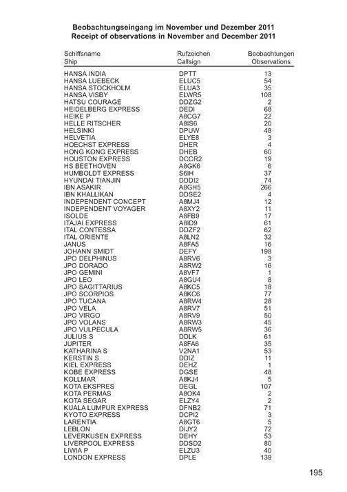 Beobachtungseingang im November und Dezember 2011 / Receipt of observations in November...