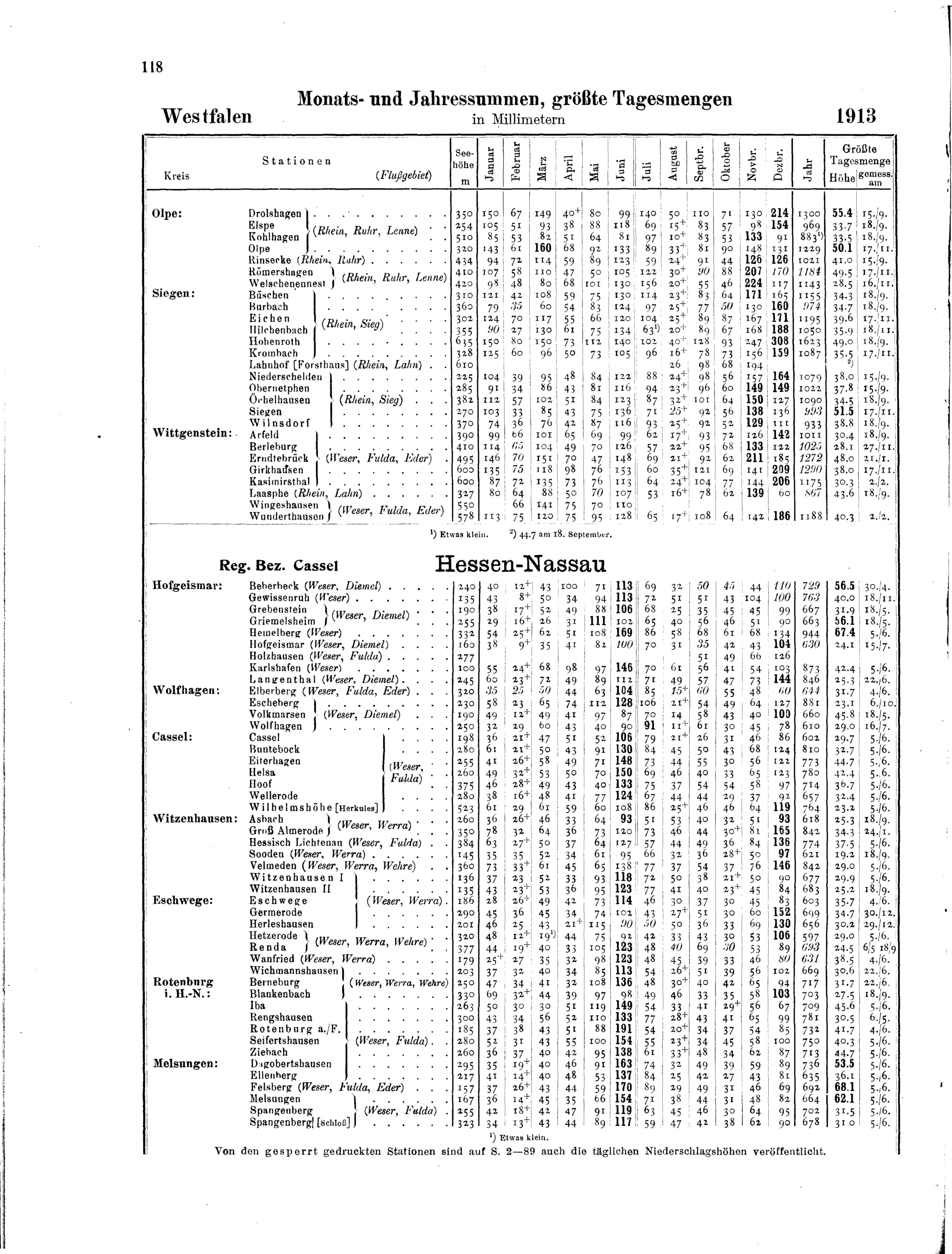 II. Monats- und Jahressummen, sowie größte Tagesmengen 1913 (Anordnung der Stationen nach...