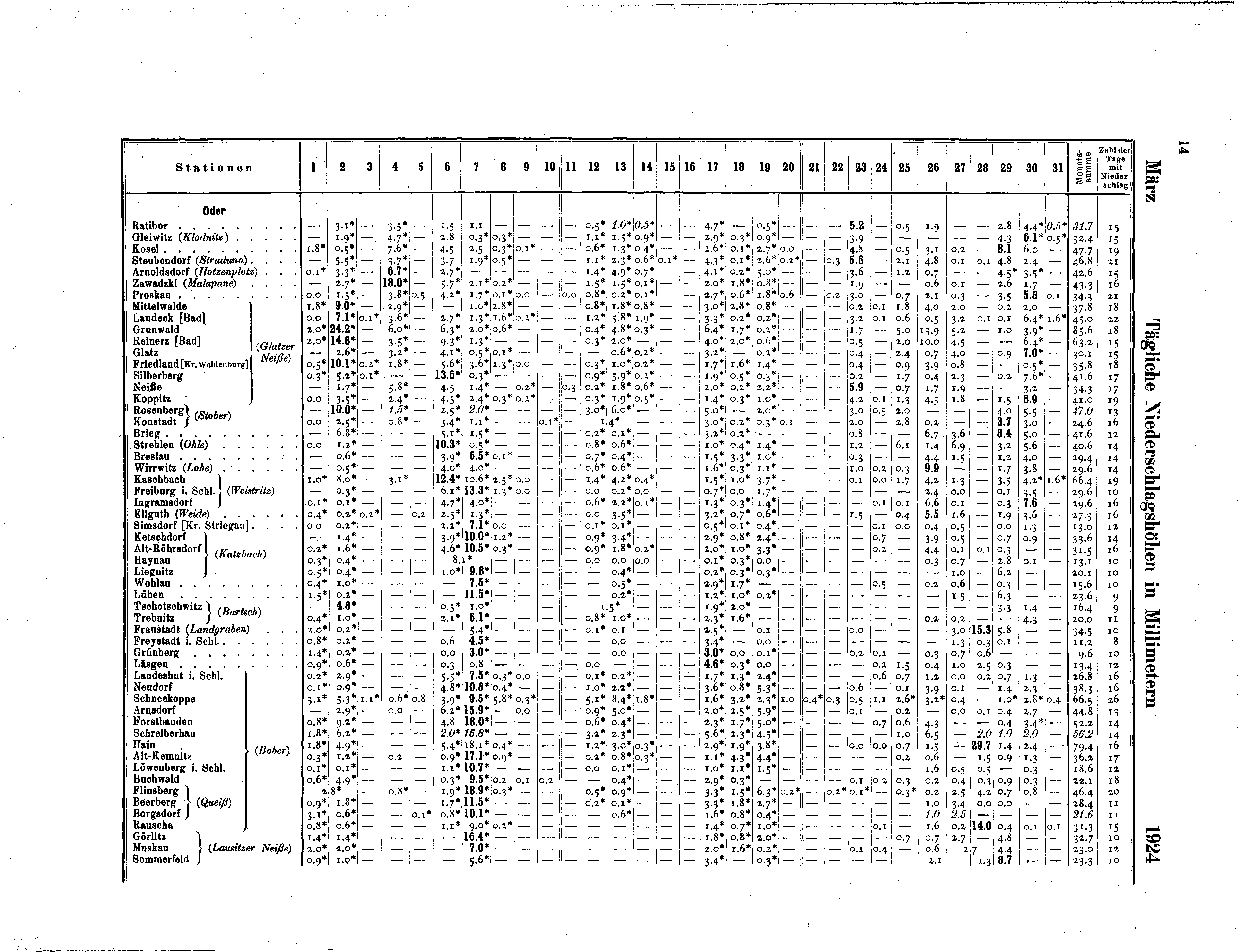 I. Tägliche Niederschlagshöhen sowie Zahl der Tage mit Niederschlag und Schnee (Anordnung der...