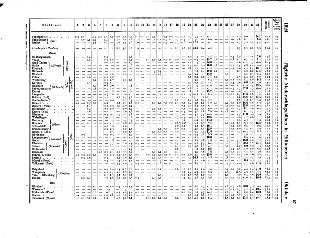 I. Tägliche Niederschlagshöhen sowie Zahl der Tage mit Niederschlag und Schnee (Anordnung der...
