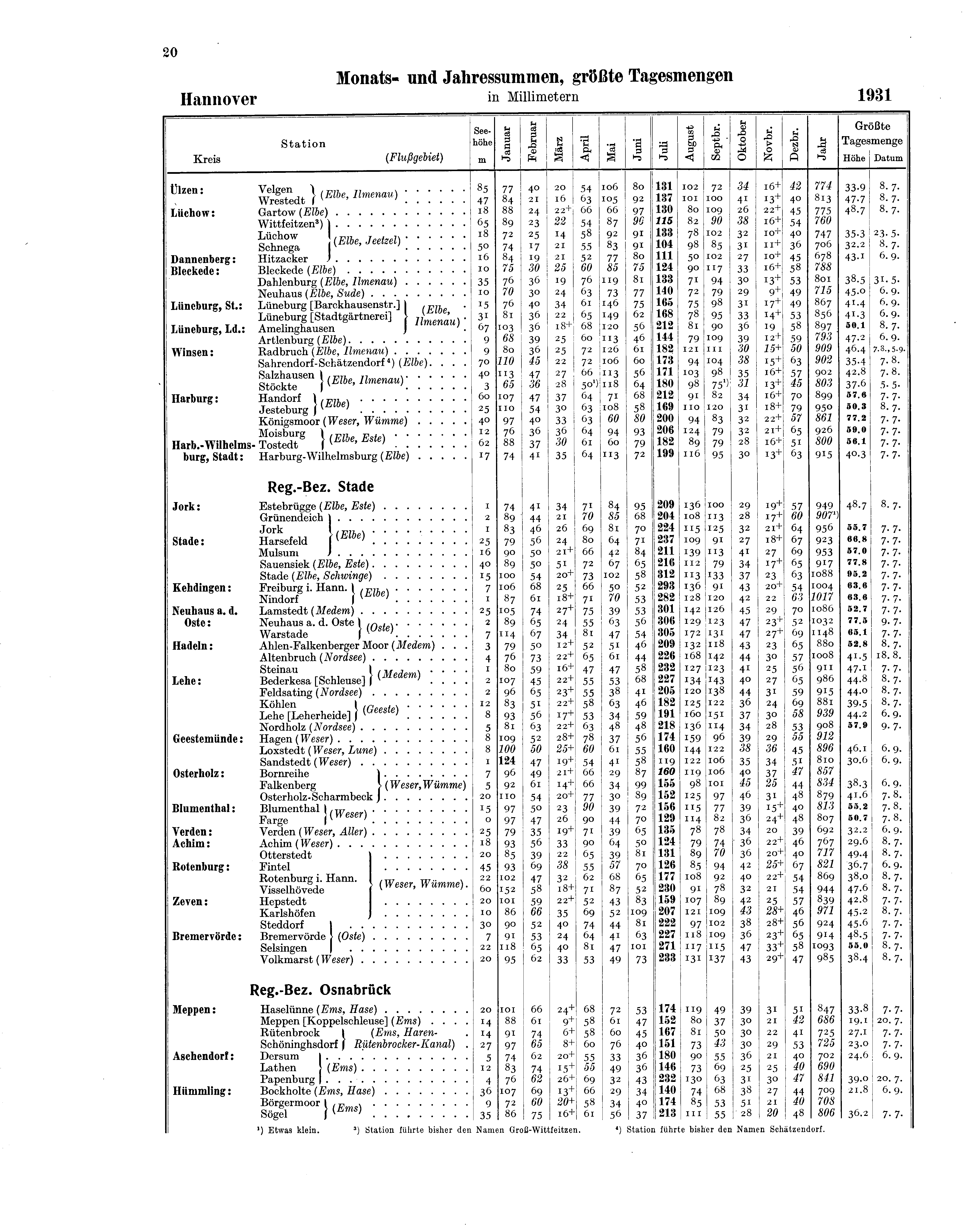 Monats- und Jahressummen sowie größte Tagesmengen des Niederschlags (Anordnung der Stationen...