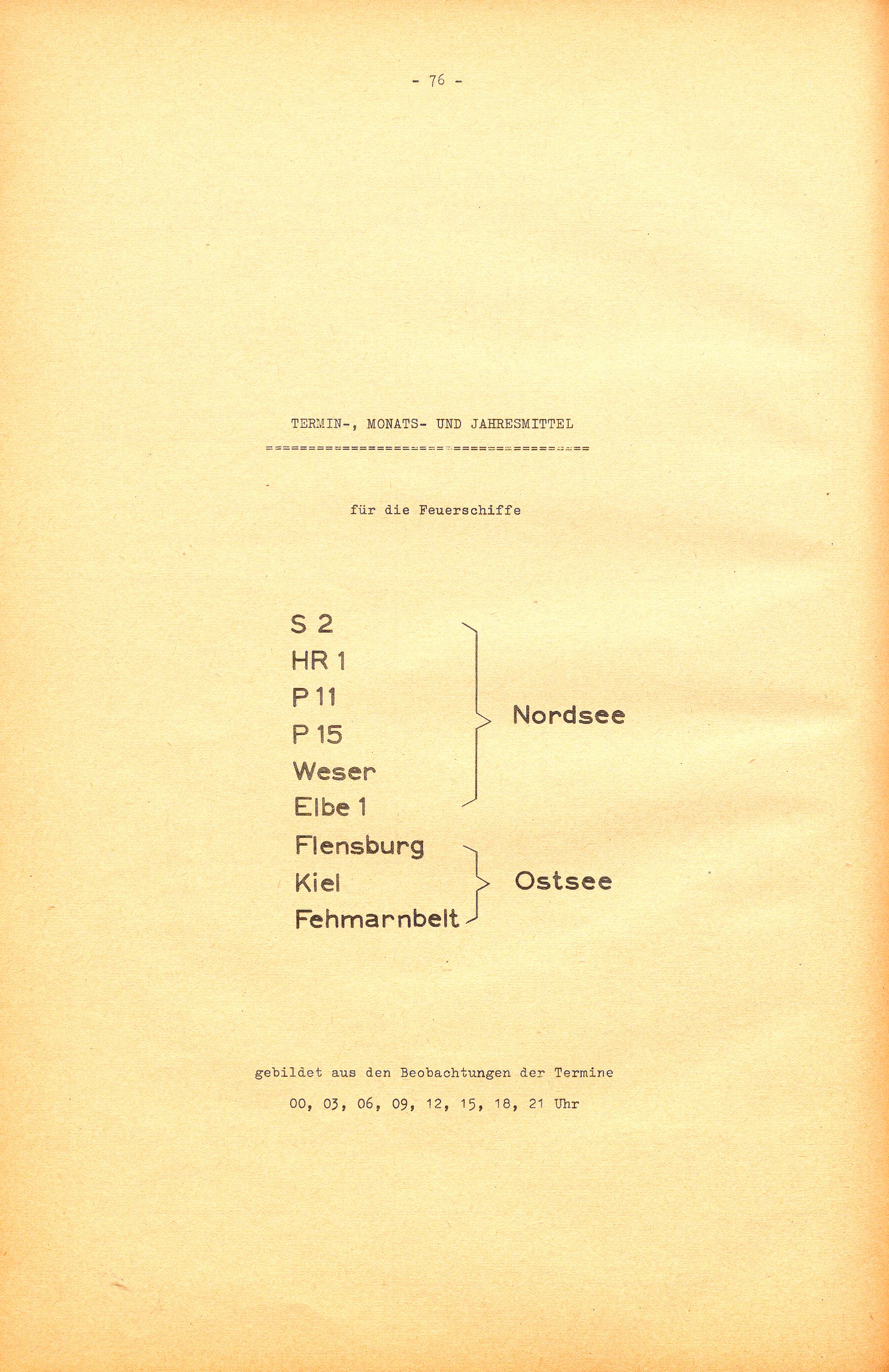 Termin-, Monats- und Jahresmittel für die Feuerschiffe S 2, HR 1, P 11, P 15, Weser, Elbe 1, Flensburg, Kiel, Fehmarnbelt