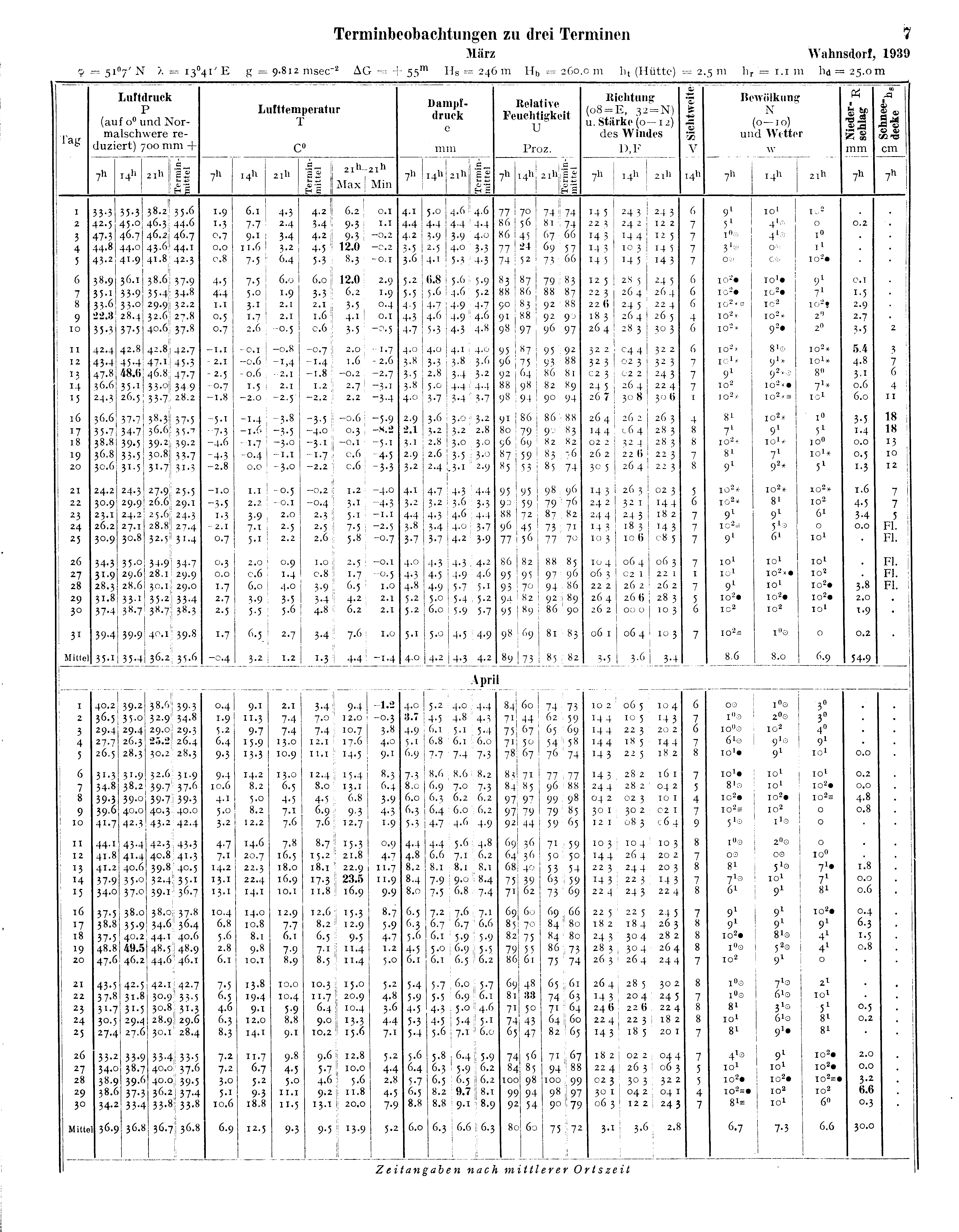 Jahresmittel von Luftdruck, Temperatur, Dampfdruck, Relativer Feuchtigkeit, Windgeschwindigkeit, Abkühlungsgröße, Sonnenscheindauer, Luftelektrischem Potentialgefälle und Leitfähigkeit, Bodentemperatur