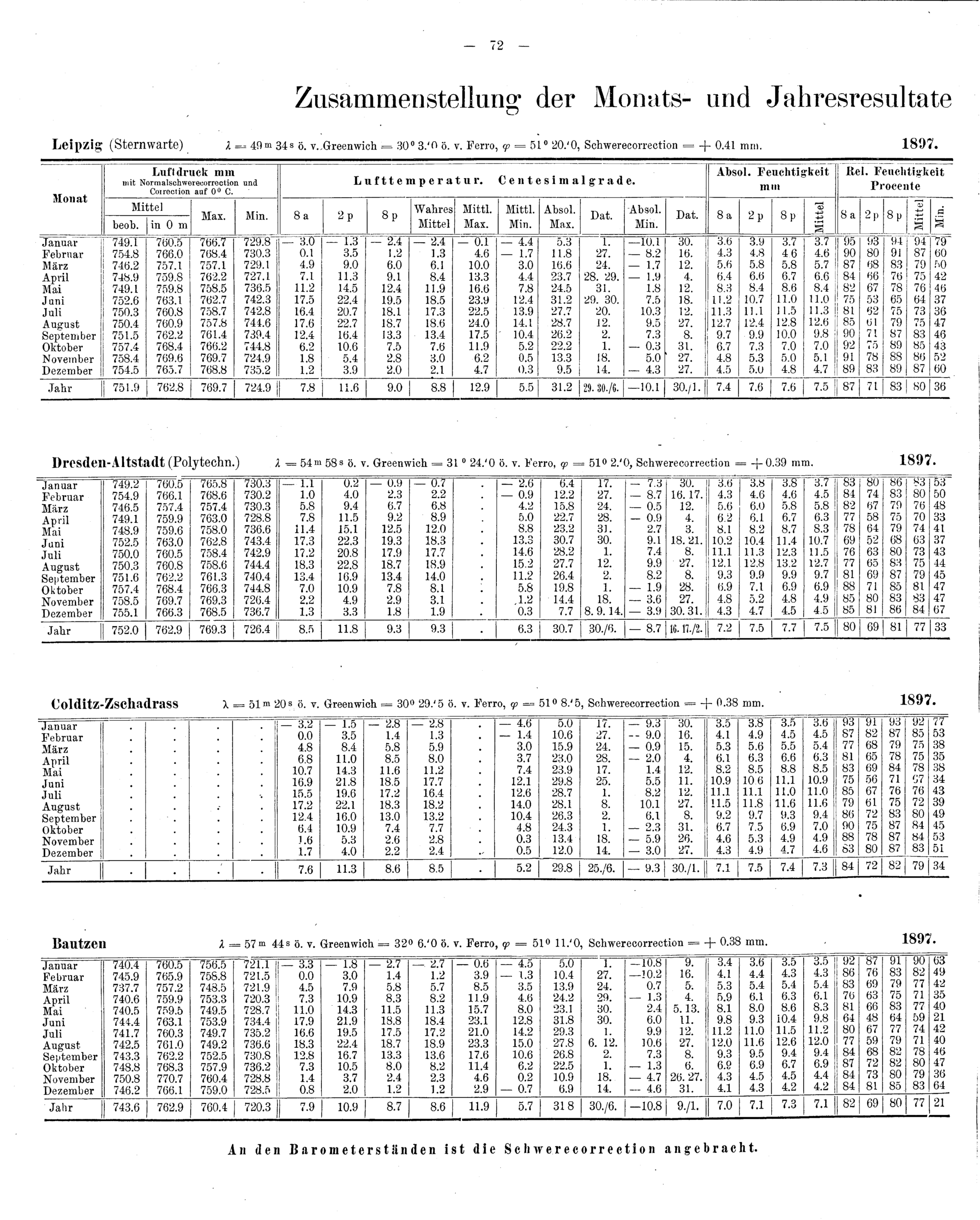 Zusammenstellung der Monats- und Jahresresultate vorstehender 11 Stationen in internationaler...