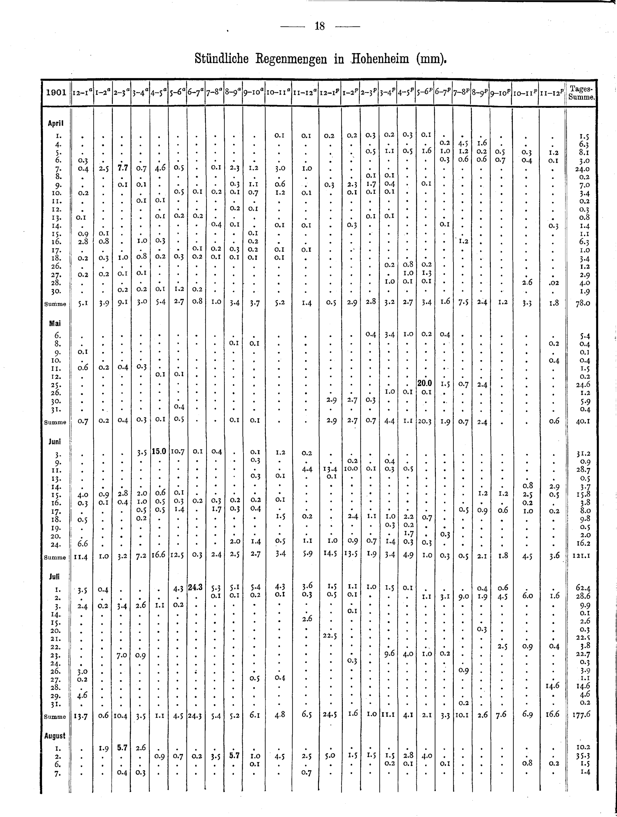 Stündliche Regenmengen während der Sommermonate in Hohenheim