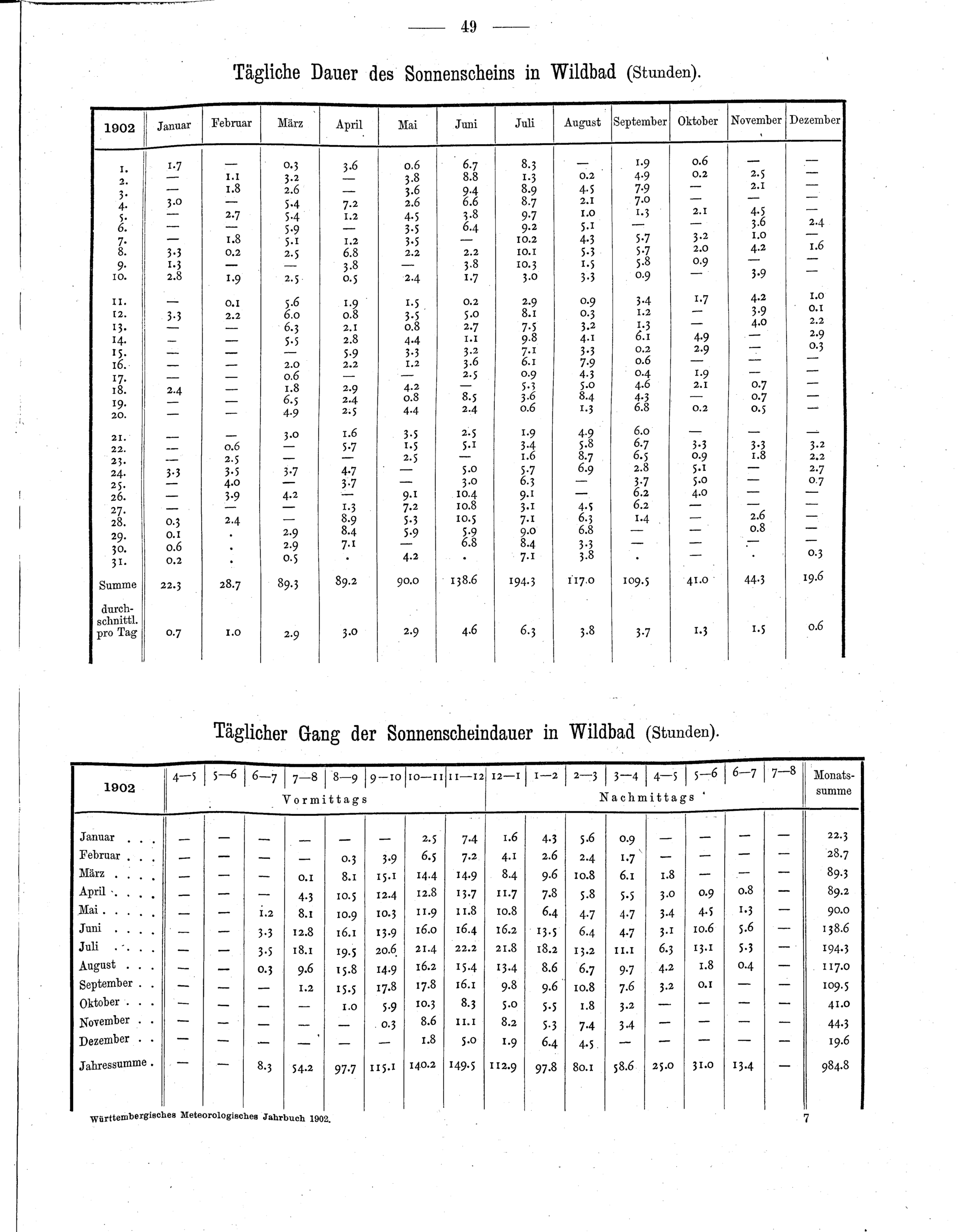 Sonnenscheinmessungen der 6 Sonnenscheinmeßstationen Biberach, Hohenheim, Schömberg,...