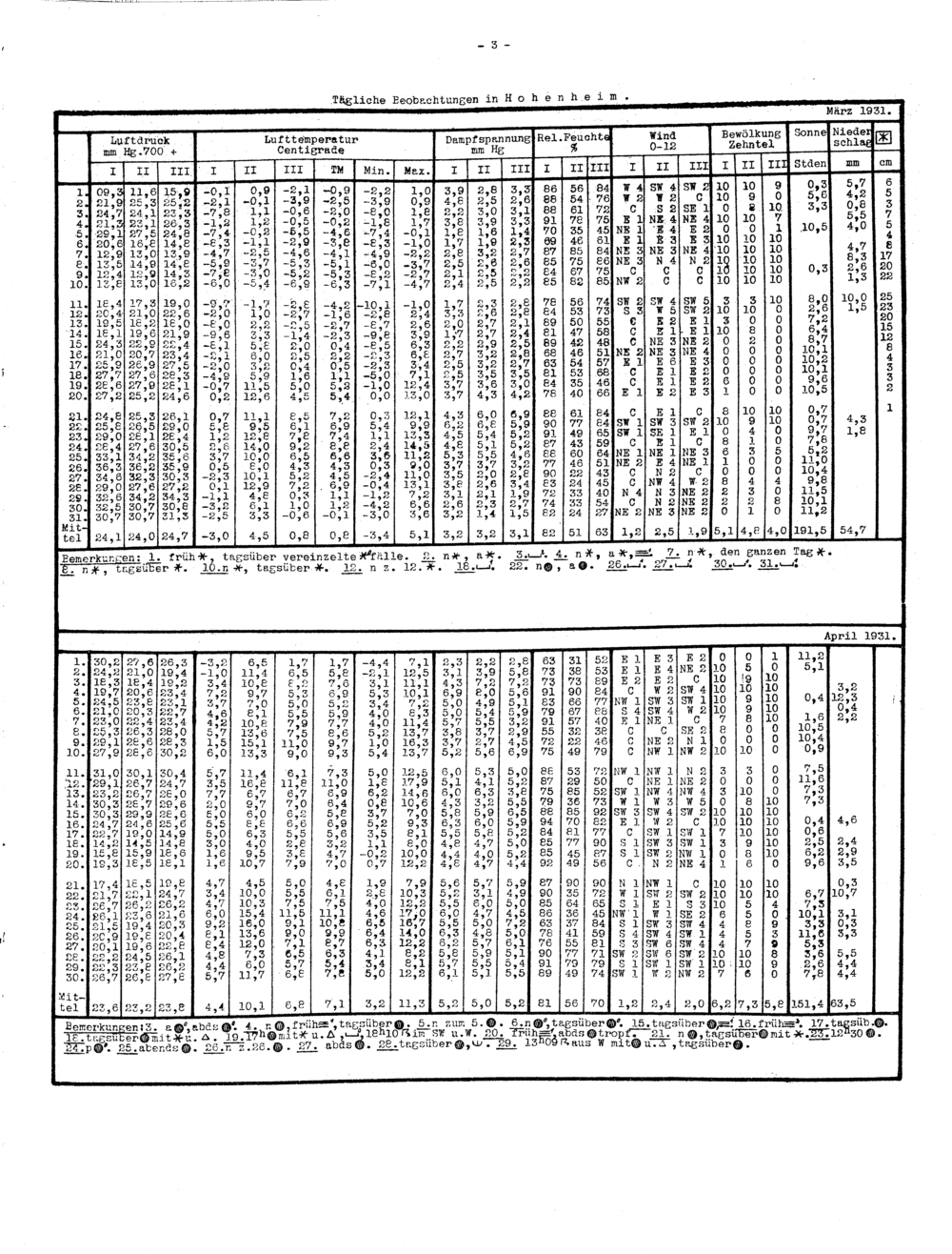Tägliche Terminbeobachtungen von Hohenheim 1931