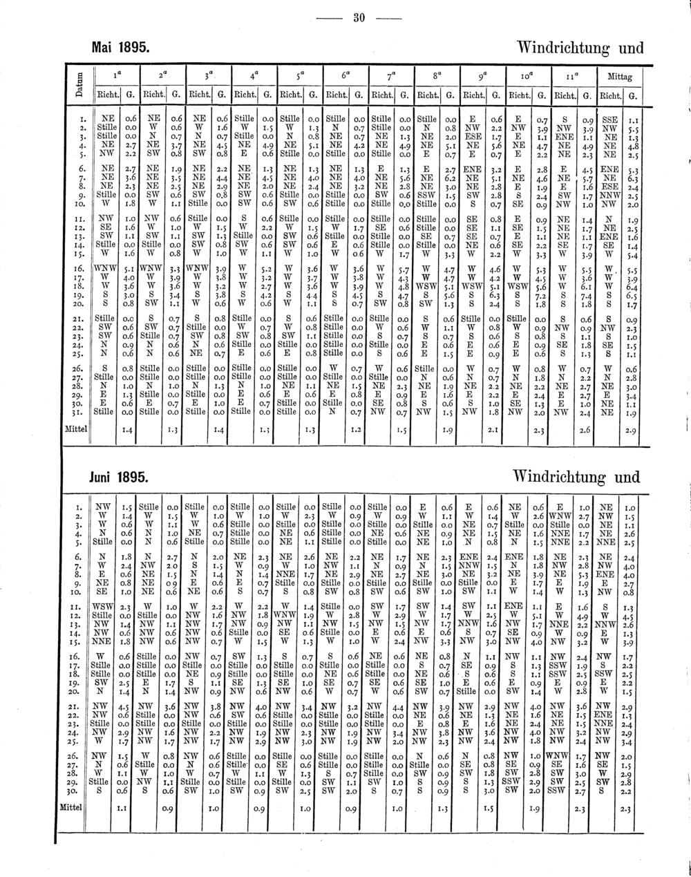 Windbeobachtungen von Hohenheim (stündliche Angaben)