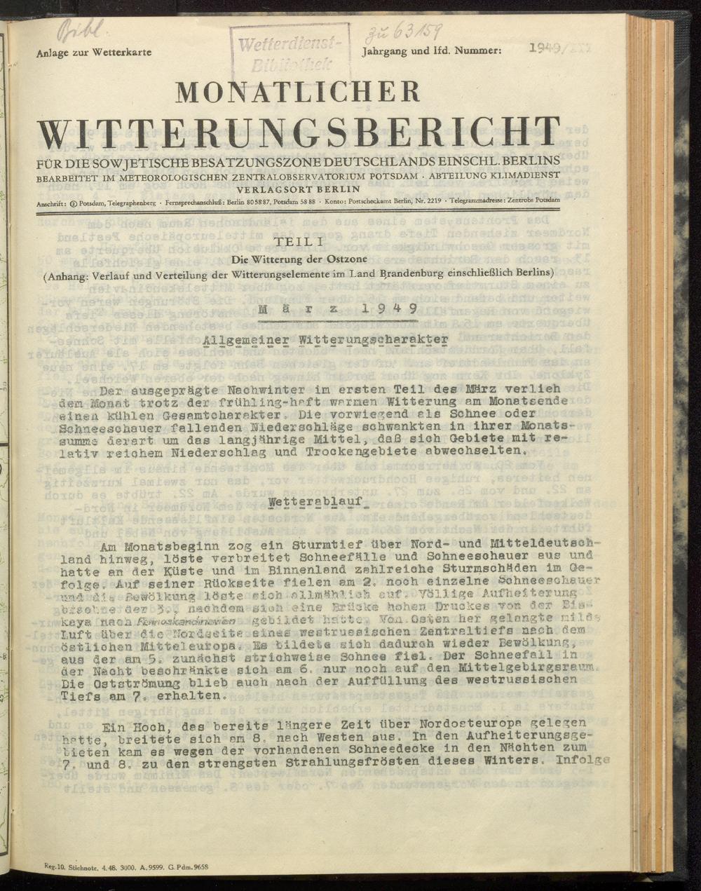 <<Die>> Witterung der Ostzone : (Anhang: Verlauf und Verteilung der Witterungselemente...