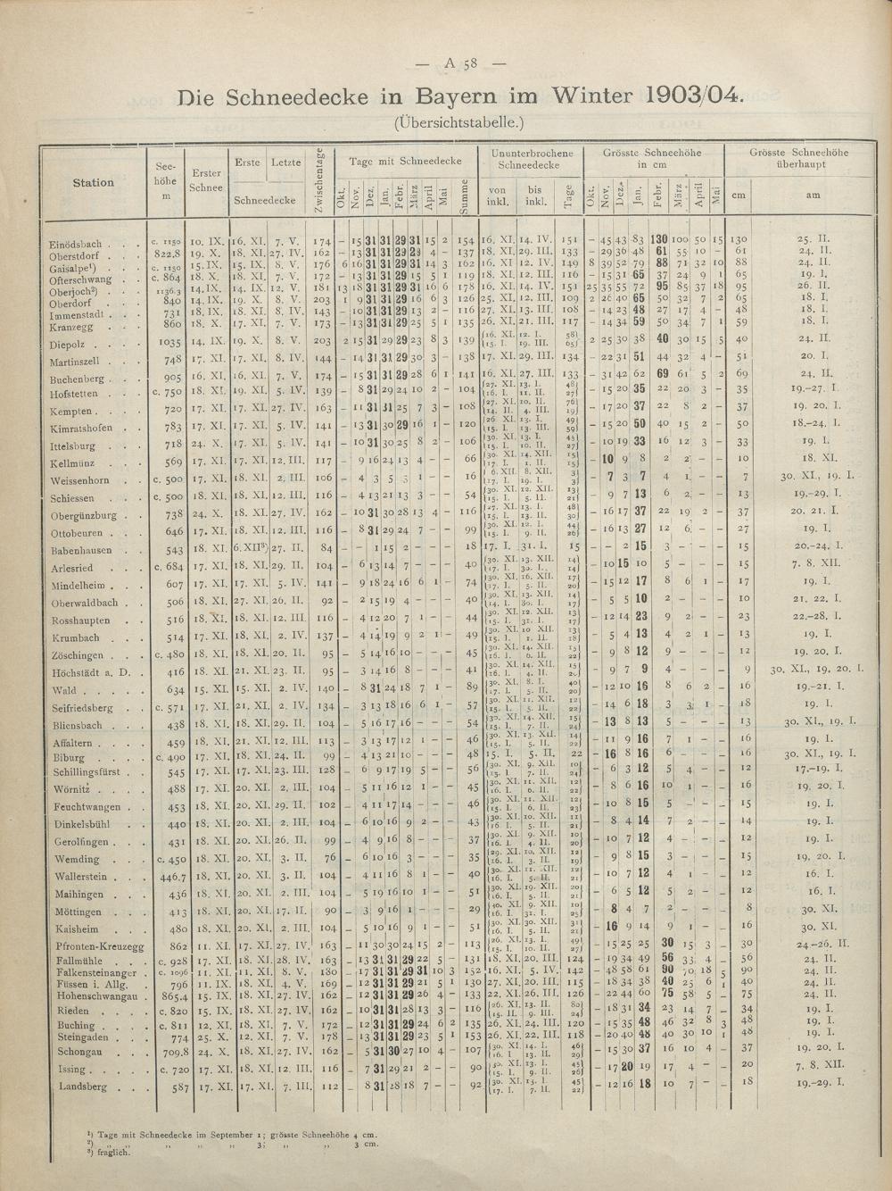 Die Schneedecke in Bayern im Winter 1903/04 - Übersichtstabelle