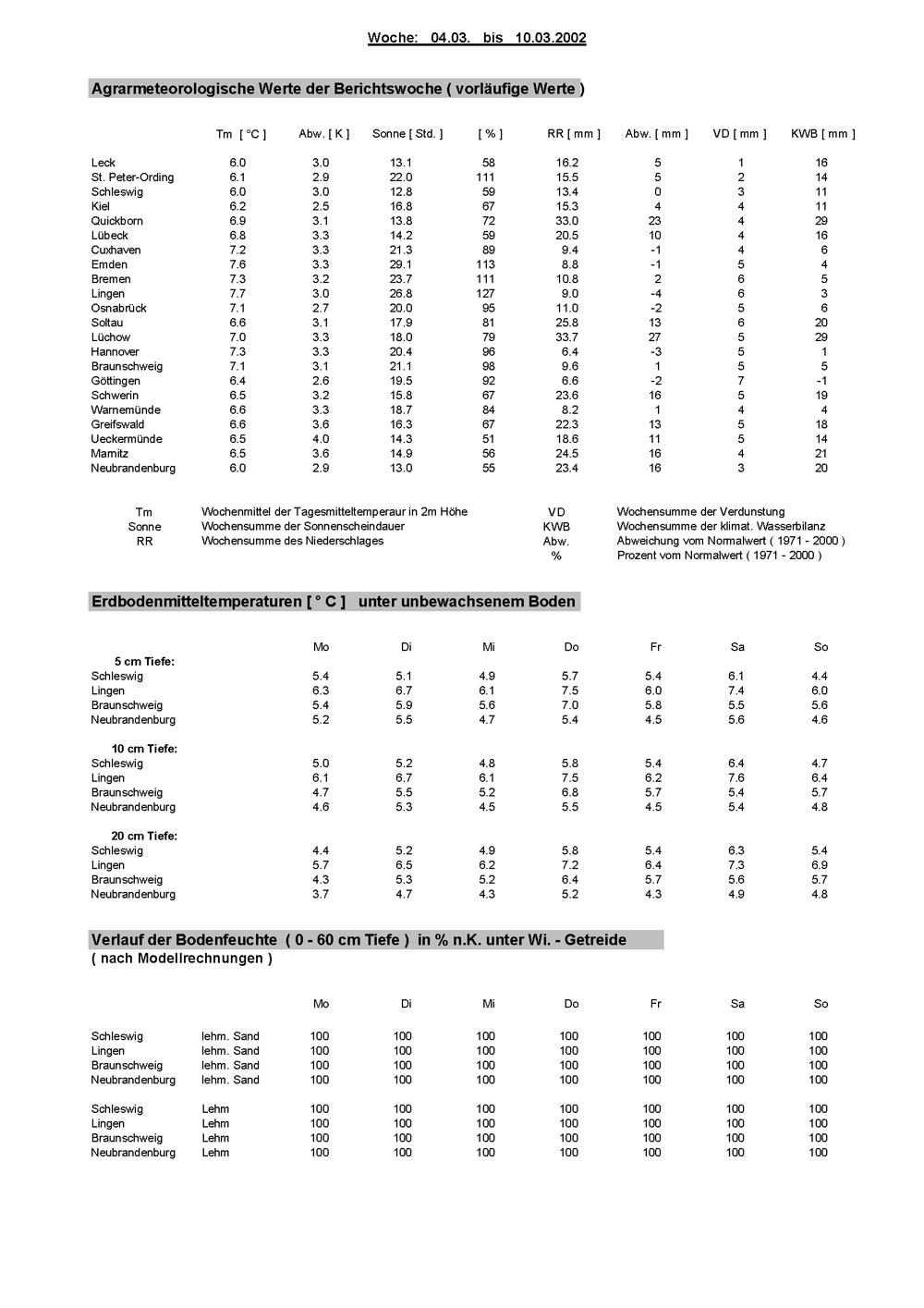 Agrarmeteorologischer Wochenbericht für Schleswig-Holstein, Hamburg, Niedersachsen,...