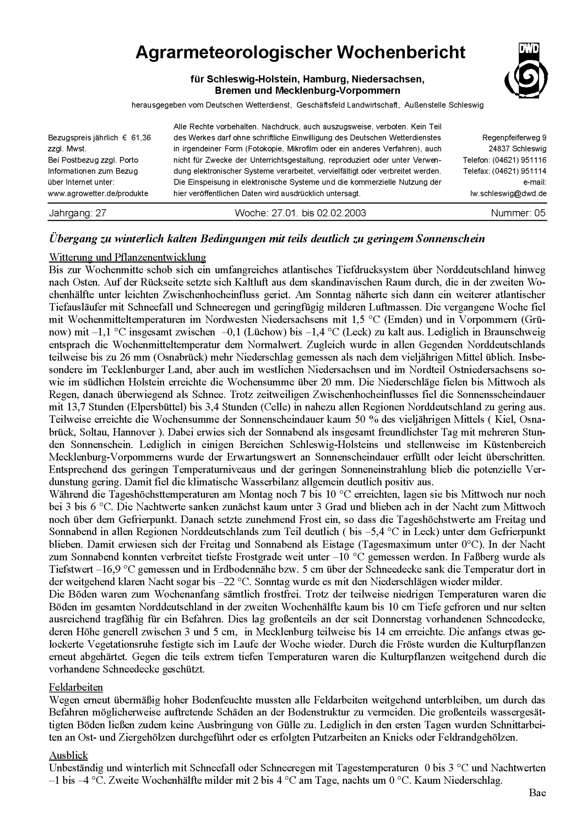 Agrarmeteorologischer Wochenbericht für Schleswig-Holstein, Hamburg, Niedersachsen,...
