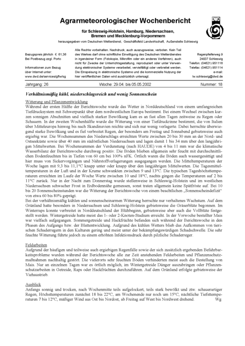 Agrarmeteorologischer Wochenbericht für Schleswig-Holstein, Hamburg, Niedersachsen,...