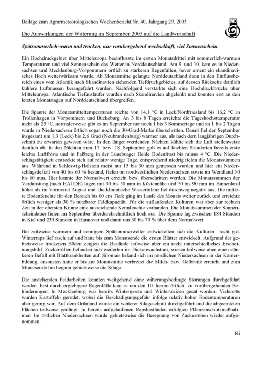 Die Auswirkung der Witterung im September 2005 auf die Landwirtschaft