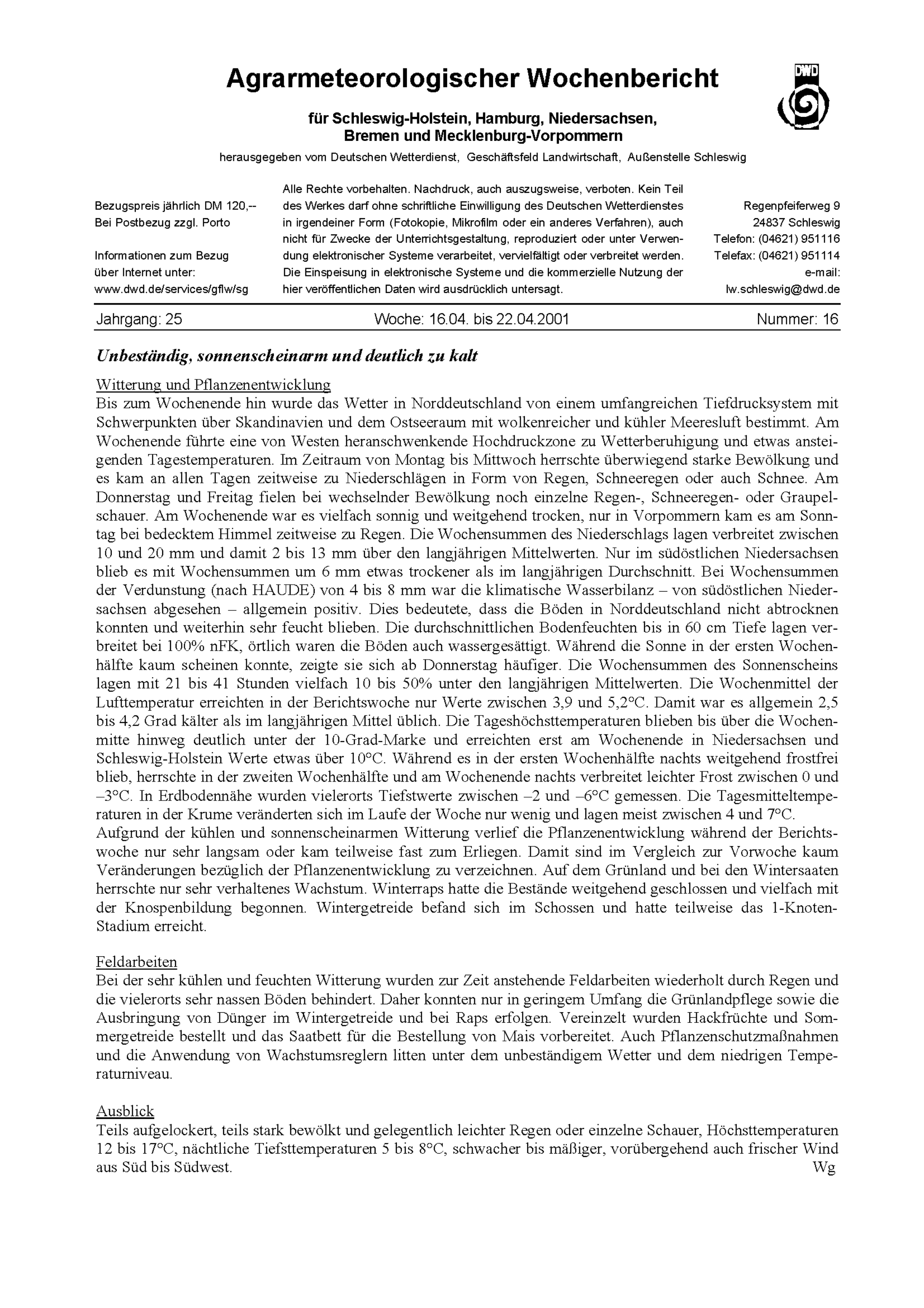Agrarmeteorologischer Wochenbericht für Schleswig-Holstein, Hamburg, Niedersachsen,...