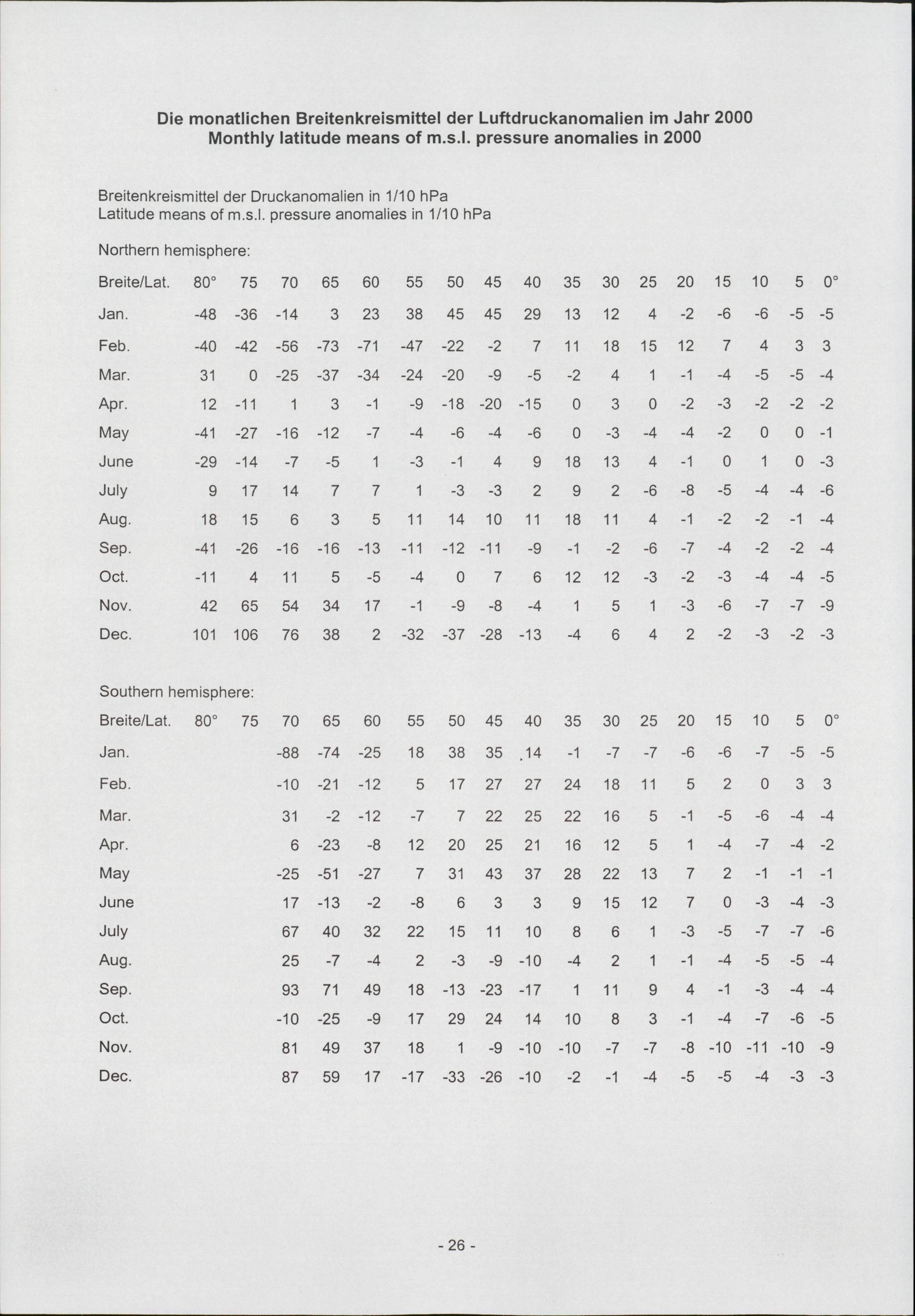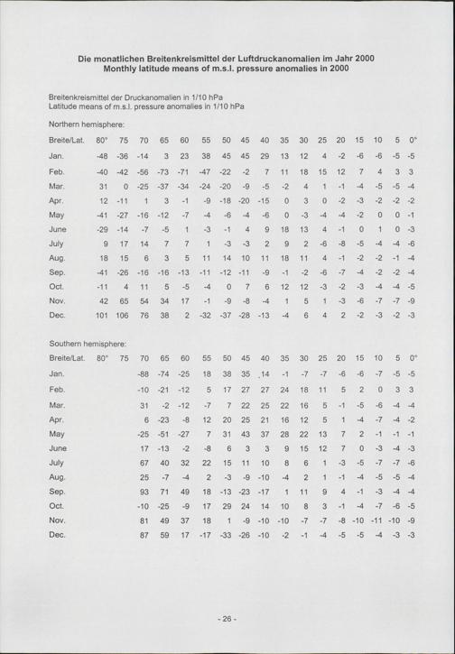 Die monatlichen Breitenkreismittel der Luftdruckanomalien im Jahr 2000