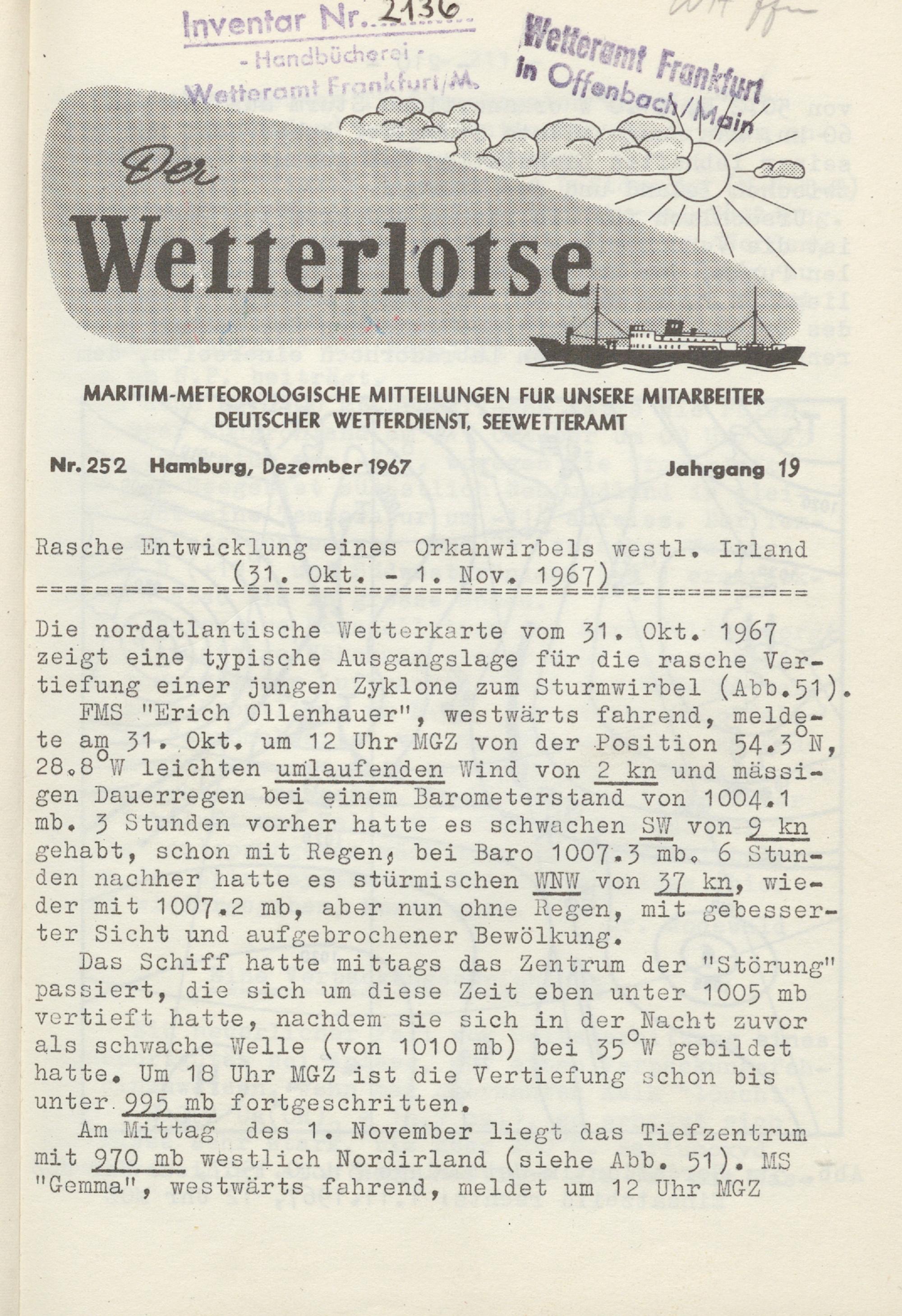 Rasche Entwicklung eines Orkanwirbels westl. Irland (31. Okt.-1. Nov. 1967)