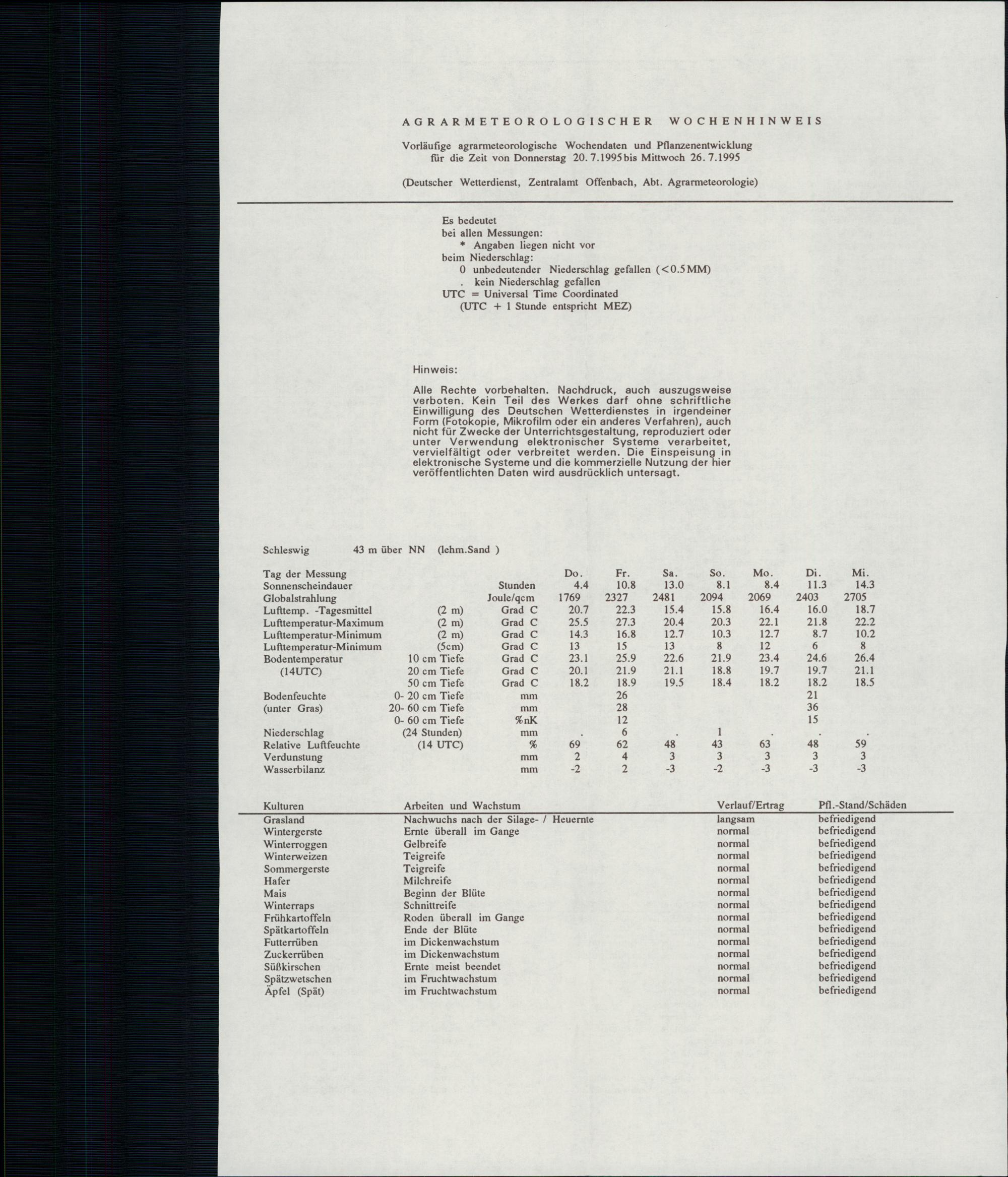 Agrarmeteorologischer Wochenhinweis für das Gebiet der Bundesrepublik Deutschlan...