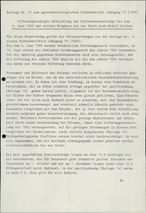 10 (1986) Beilagen. Witterungsbedingte Entwicklung der Winterweizenerträge bis zum 9. Juni 1986 und weitere Prognose bis zur Ernte nach Modell Ritchie