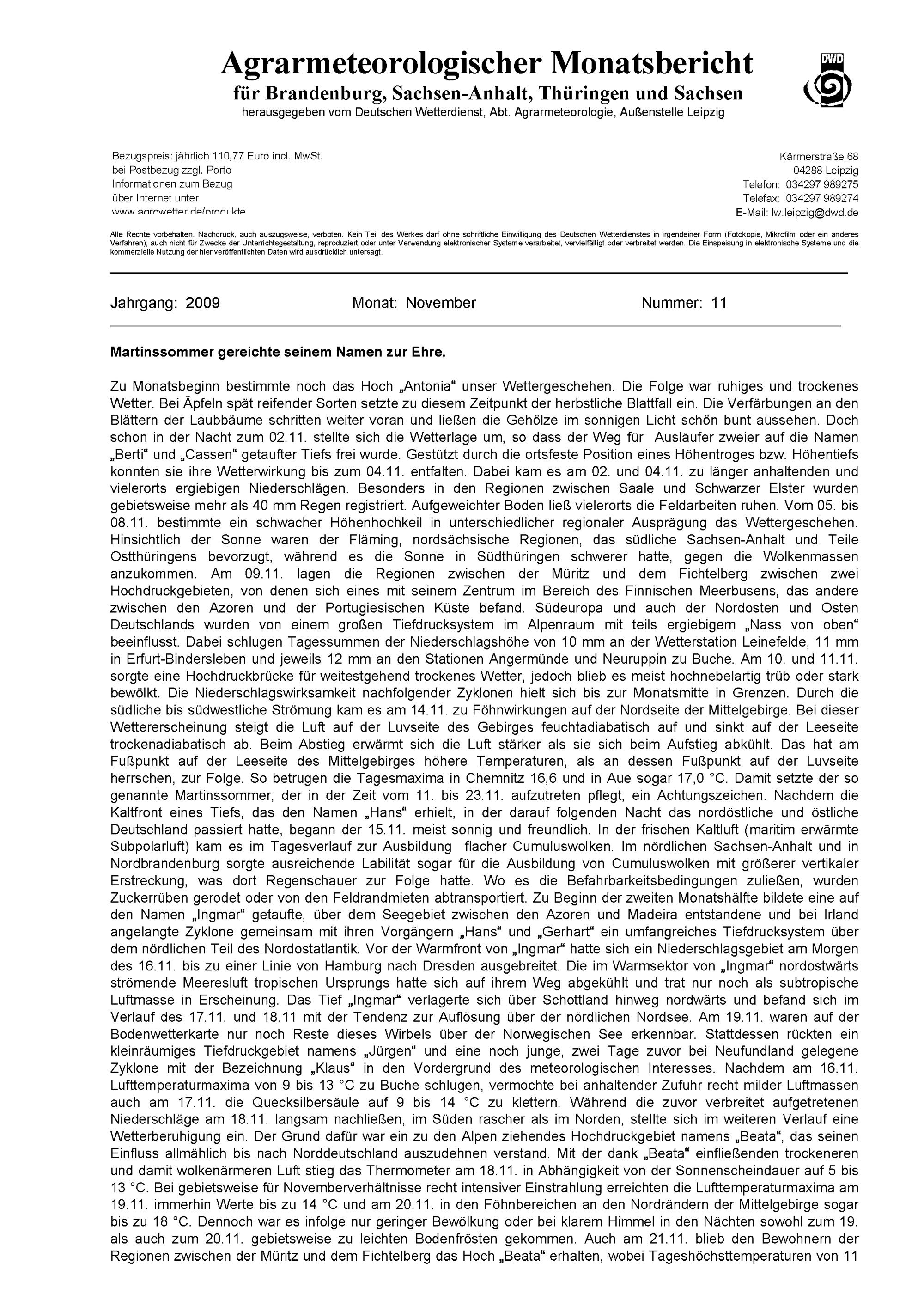 Agrarmeteorologischer Monatsbericht für Brandenburg, Sachsen-Anhalt, Thüringen und...