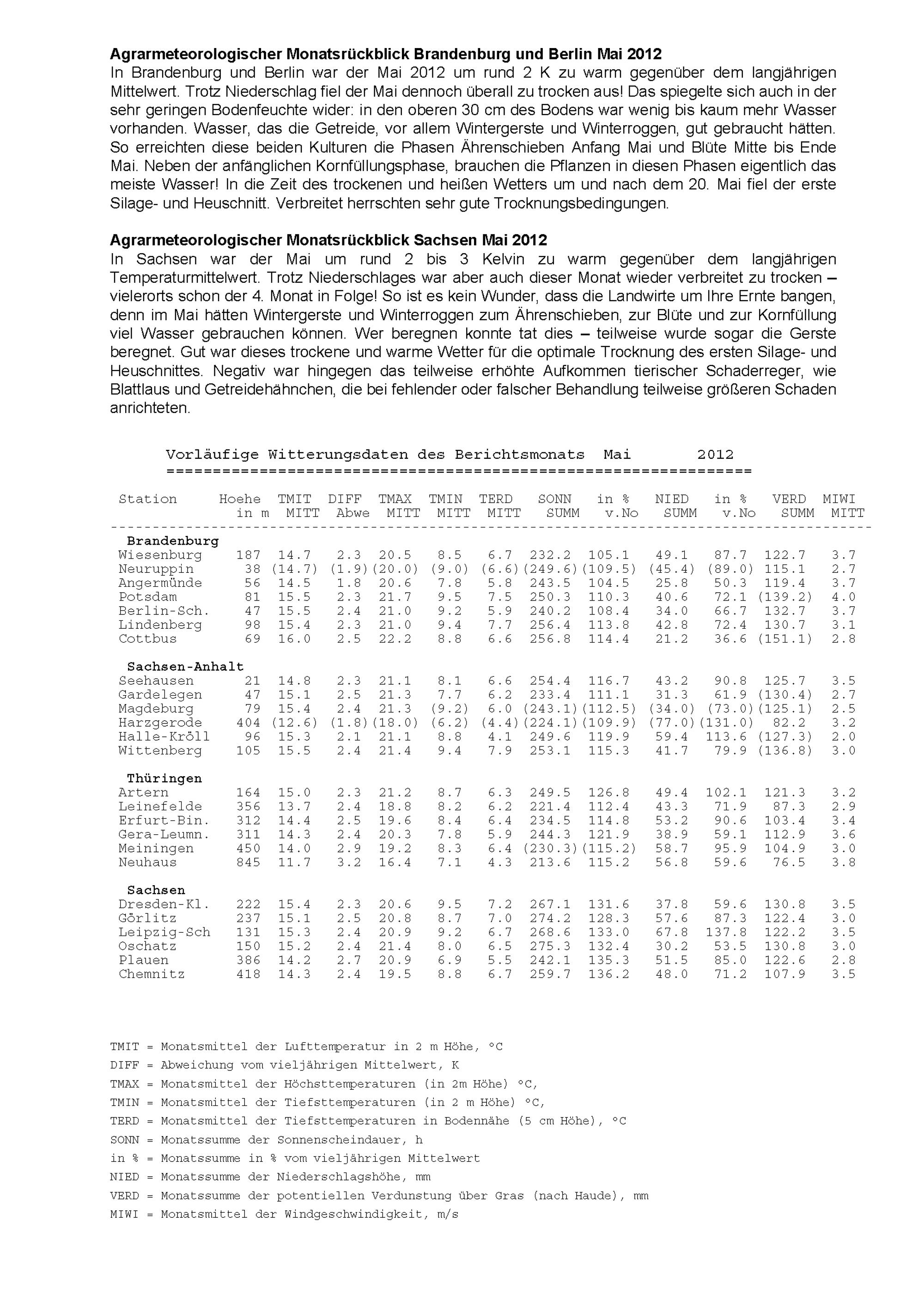 Agrarmeteorologischer Monatsbericht für Brandenburg, Sachsen-Anhalt, Thüringen und...