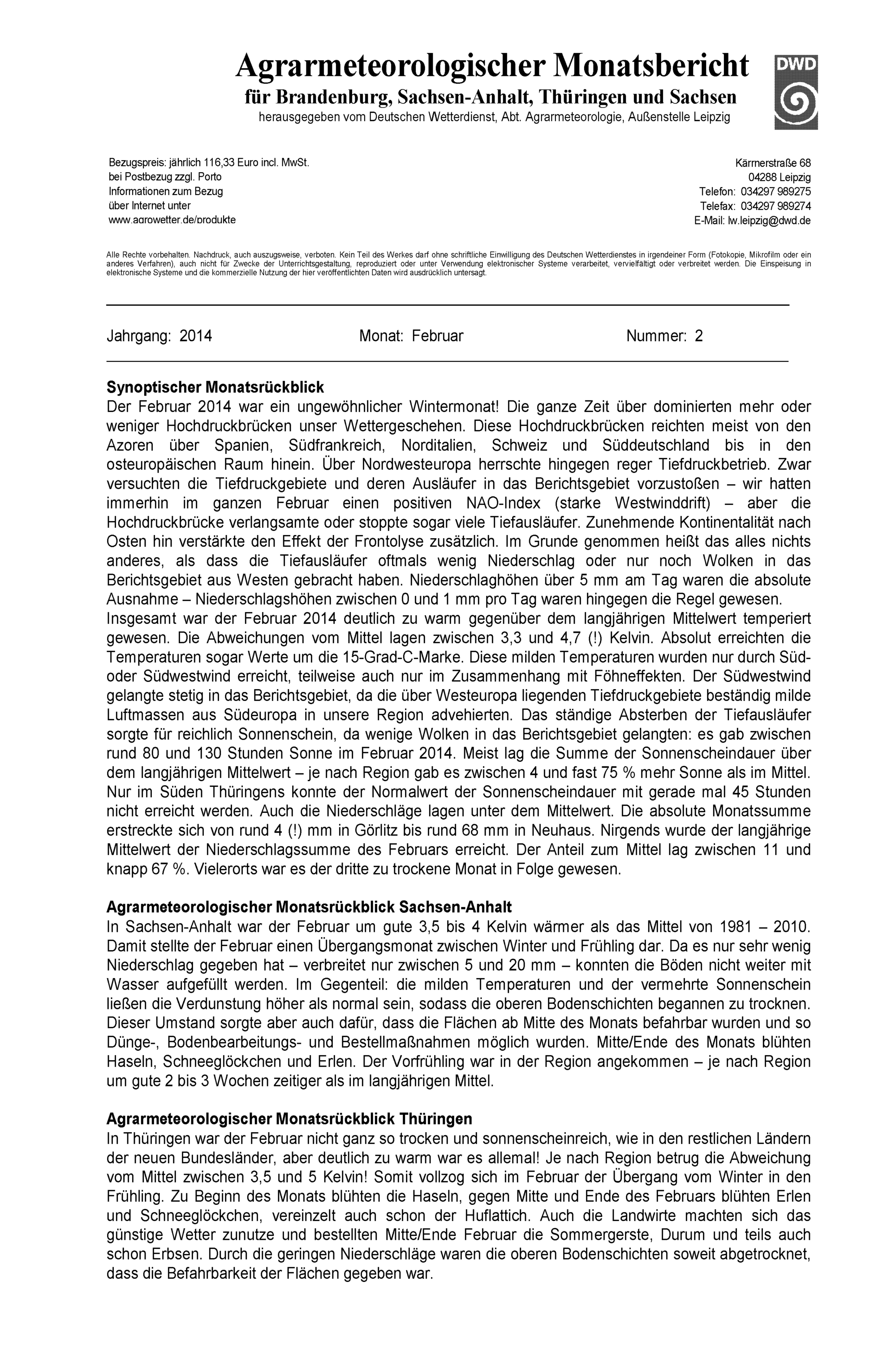 Agrarmeteorologischer Monatsbericht für Brandenburg, Sachsen-Anhalt, Thüringen und...