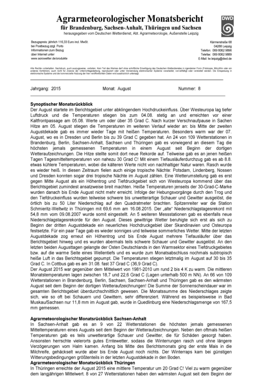 Agrarmeteorologischer Monatsbericht für Brandenburg, Sachsen-Anhalt, Thüringen und...