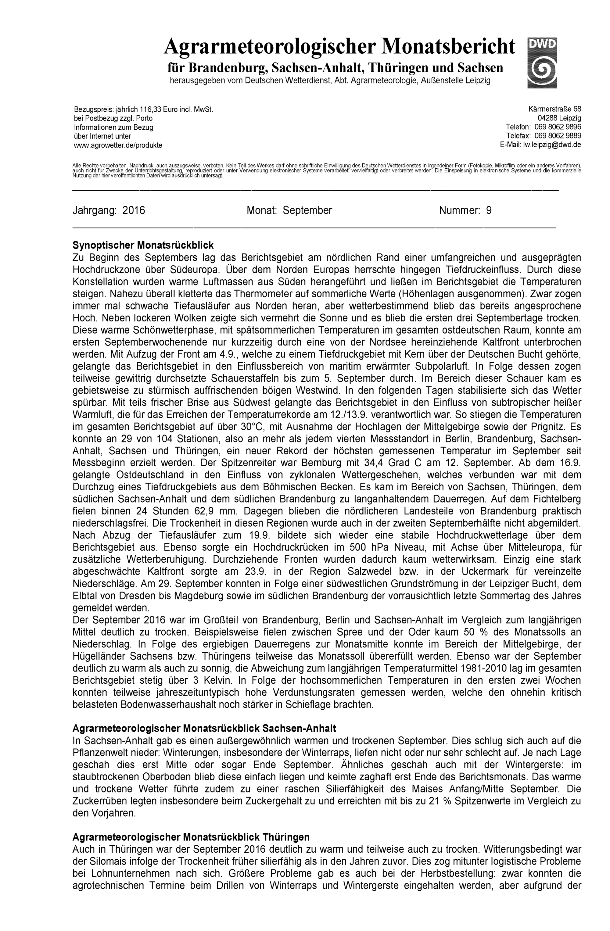 Agrarmeteorologischer Monatsbericht für Brandenburg, Sachsen-Anhalt, Thüringen und...