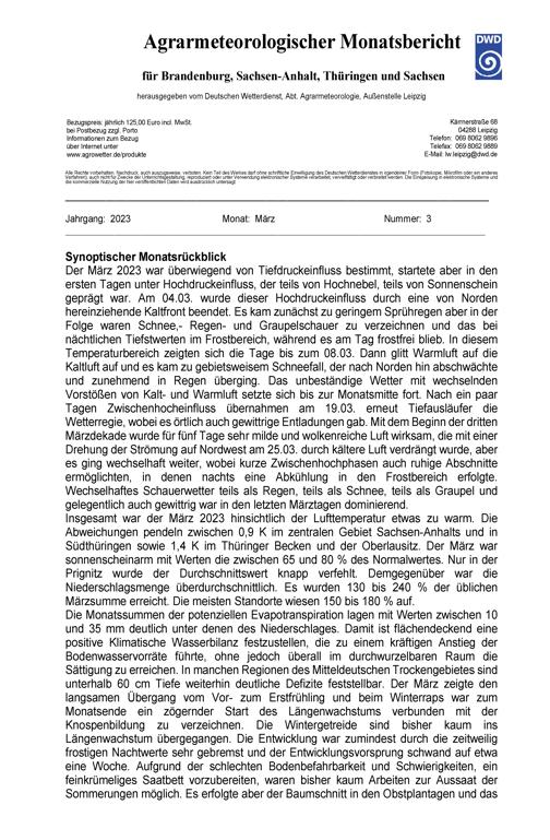 Agrarmeteorologischer Monatsbericht für Brandenburg, Sachsen-Anhalt, Thüringen und...