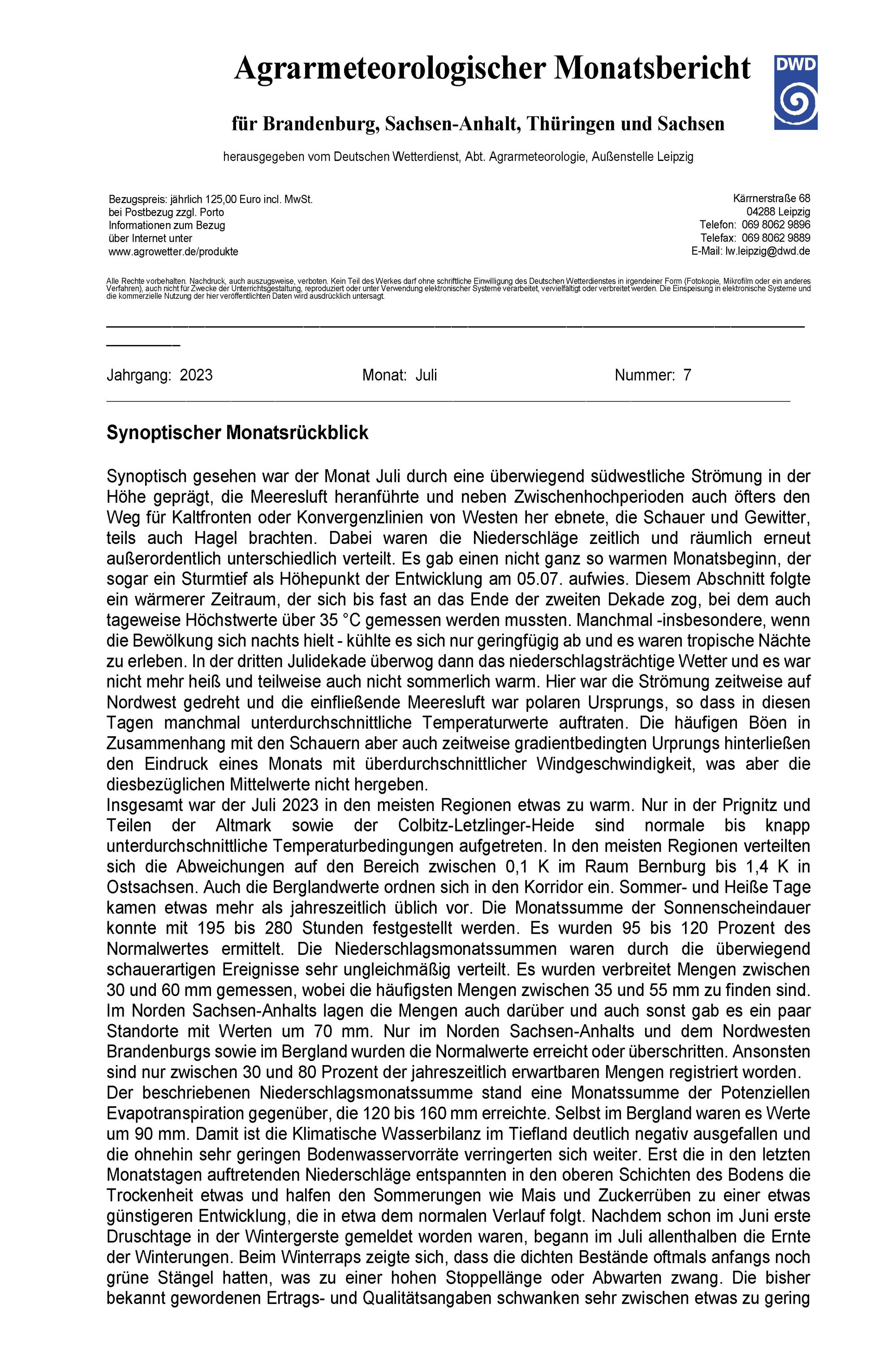 Agrarmeteorologischer Monatsbericht für Brandenburg, Sachsen-Anhalt, Thüringen und...