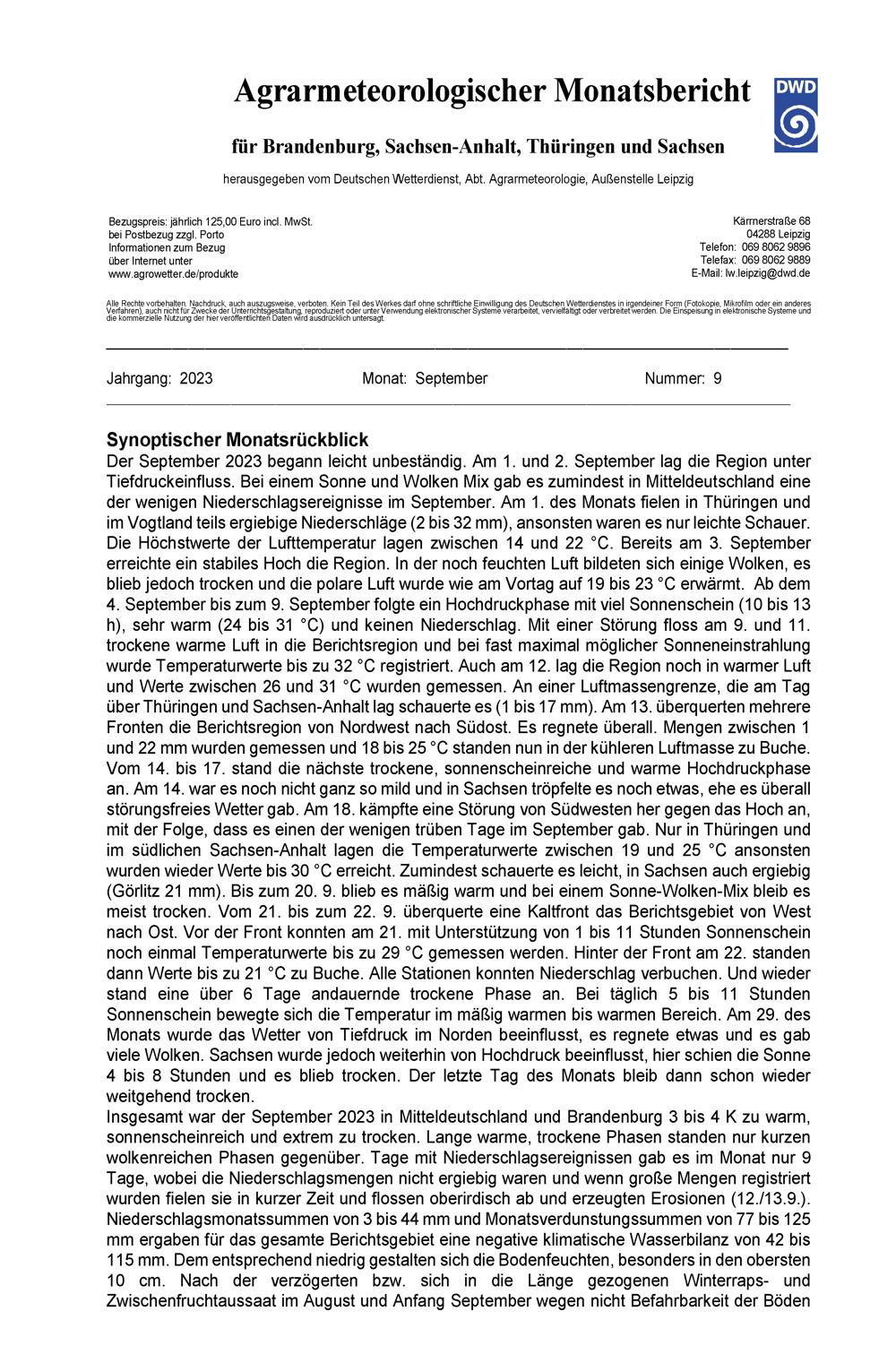 Agrarmeteorologischer Monatsbericht für Brandenburg, Sachsen-Anhalt, Thüringen und...