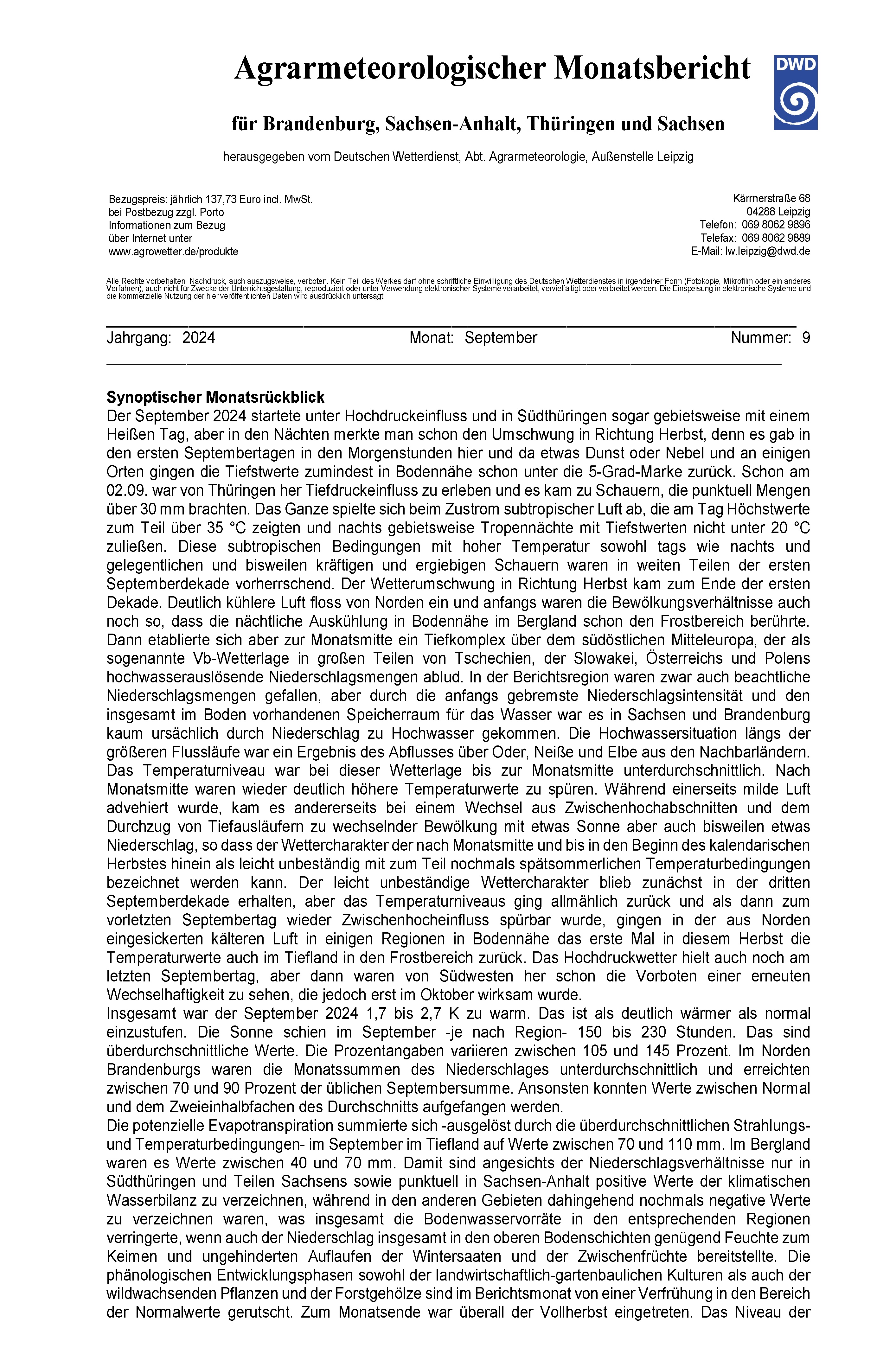 Agrarmeteorologischer Monatsbericht für Brandenburg, Sachsen-Anhalt, Thüringen und...