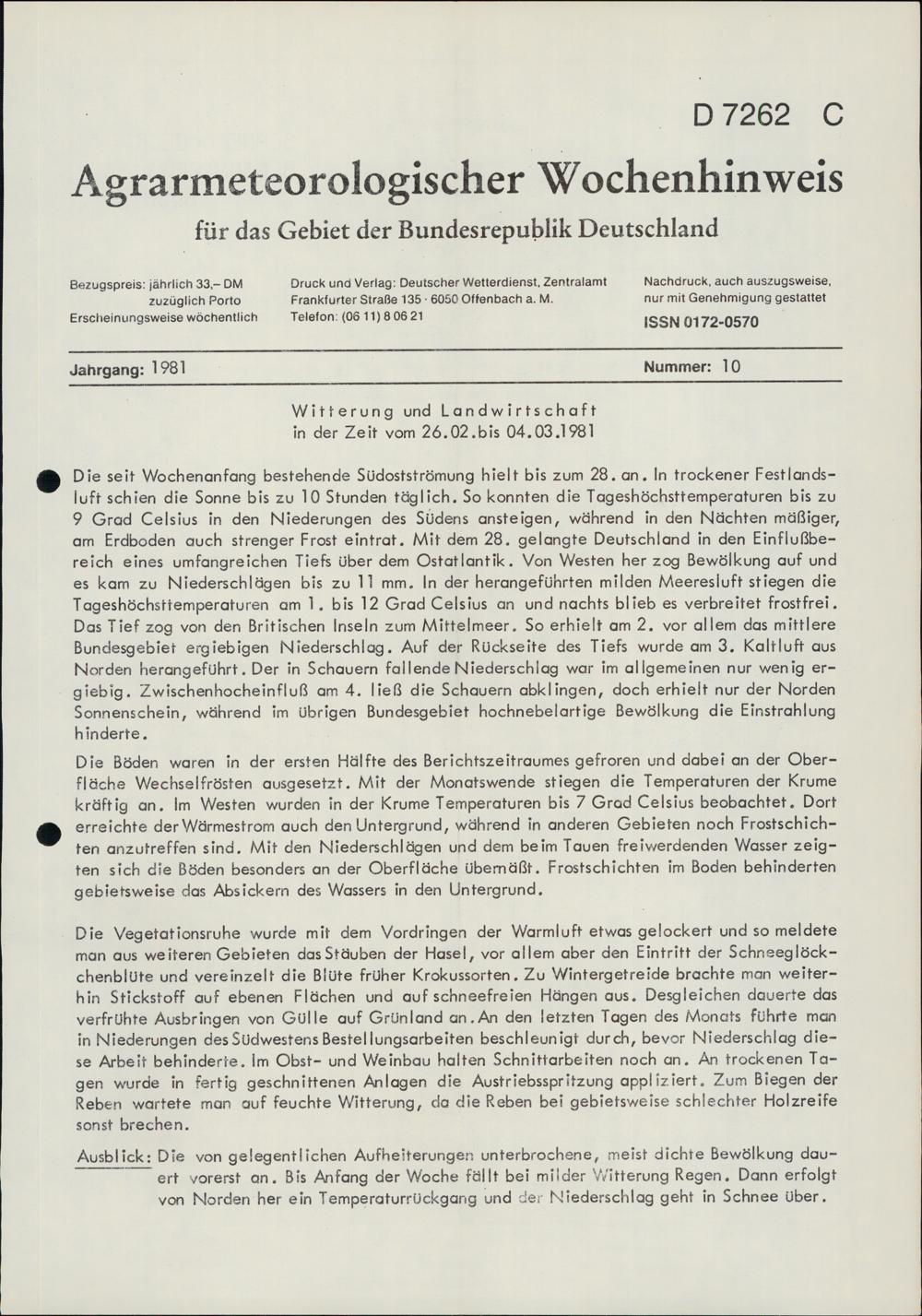 Agrarmeteorologischer Wochenhinweis für das Gebiet der Bundesrepublik Deutschlan...