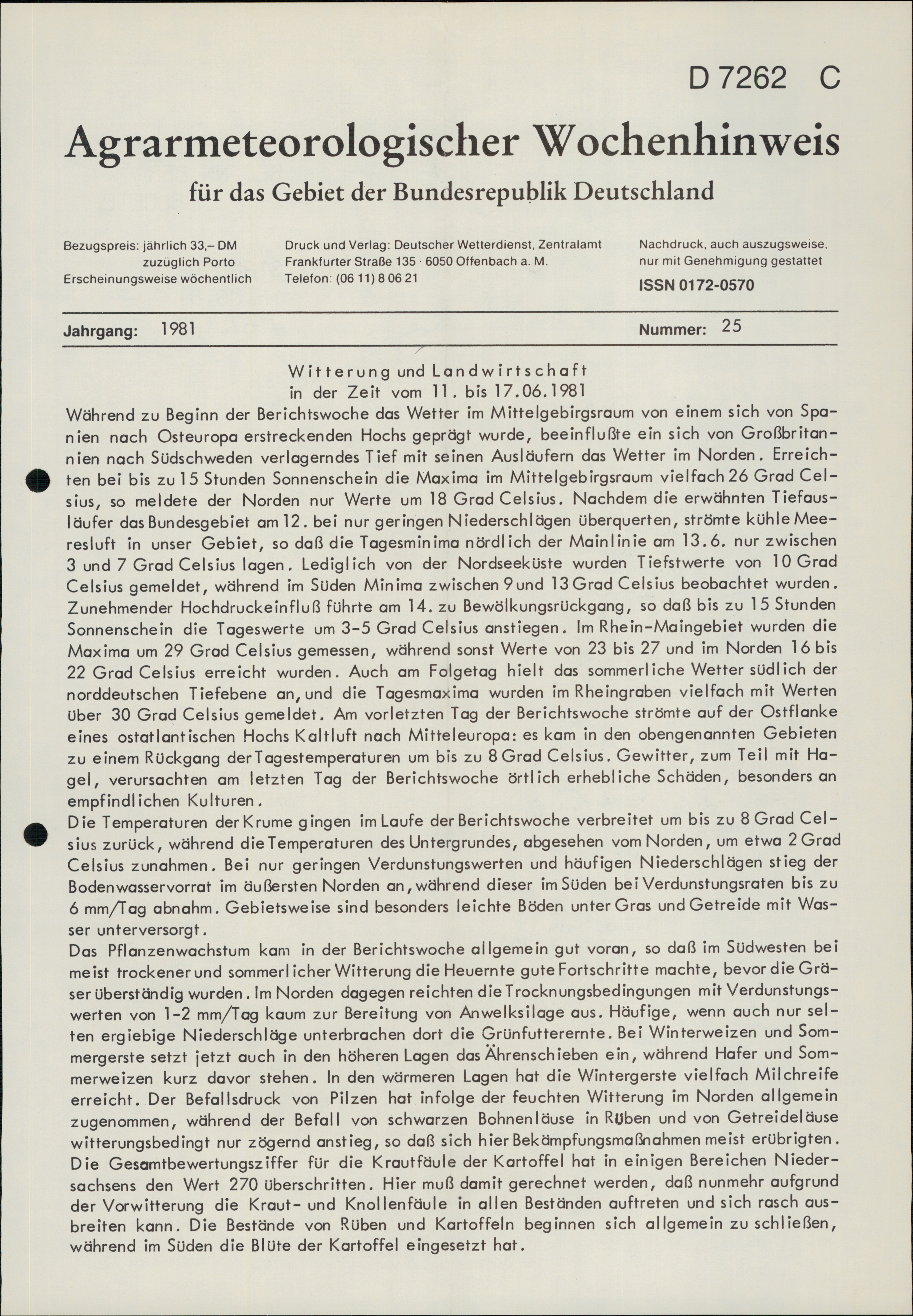 Agrarmeteorologischer Wochenhinweis für das Gebiet der Bundesrepublik Deutschlan...