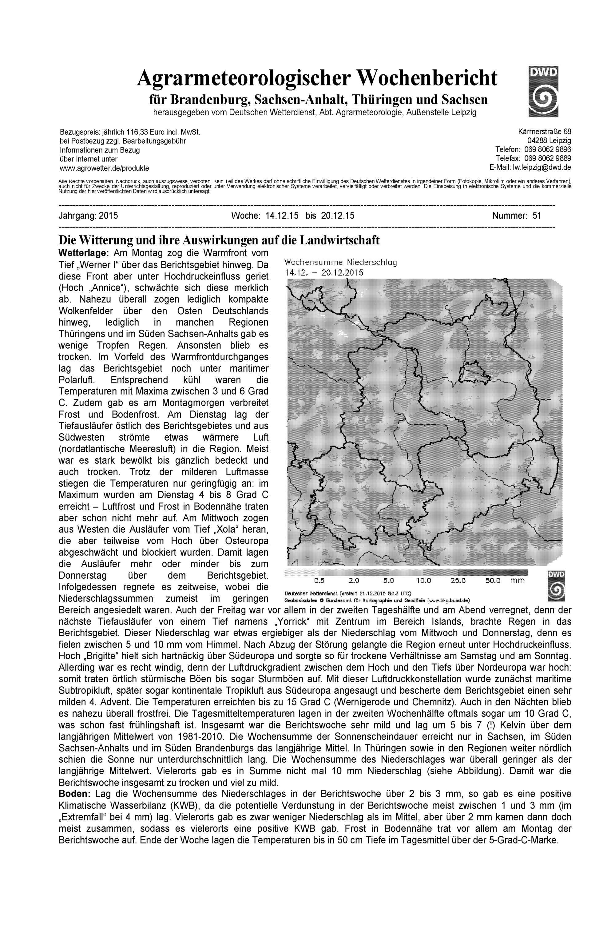 Agrarmeteorologischer Wochenbericht für Sachsen, Sachsen-Anhalt, Thüringen und B...